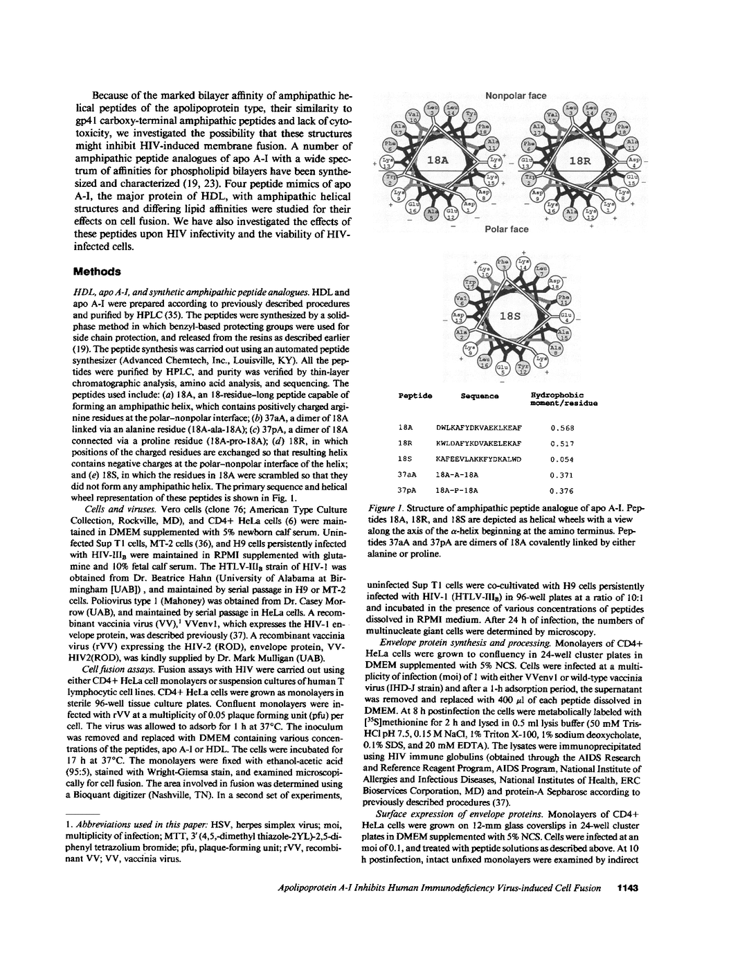 The envelope (membrane) glycoprotein of HIV is essential for virus attachment and entry into host cells. Additionally, when expressed on the plasma membrane of infected cells, the envelope protein is responsible for mediating cell-cell fusion which leads to the formation of multinucleated giant cells, one of the major cytopathic effects of HIV infections. The envelope glycoproteins of HIV contain regions that can fold into amphipathic alpha-helixes, and these regions have been suggested to play a role in subunit associations and in virus-induced cell fusion and cytopathic effects of HIV. We therefore tested the possibility that amphipathic helix-containing peptides and proteins may interfere with the HIV amphipathic peptides and inhibit those steps of HIV infection involving membrane fusion. Apolipoprotein A-I, the major protein component of high density lipoprotein, and its amphipathic peptide analogue were found to inhibit cell fusion, both in HIV-1-infected T cells and in recombinant vaccinia-virus-infected CD4+ HeLa cells expressing HIV envelope protein on their surfaces. The amphipathic peptides inhibited the infectivity of HIV-1. The inhibitory effects were manifest when the virus, but not cells, was pretreated with the peptides. Also, a reduction in HIV-induced cell killing was observed when virus-infected cell cultures were maintained in presence of amphipathic peptides. These results have potential implications for HIV biology and therapy.