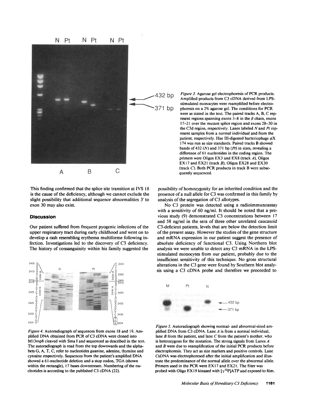Hereditary deficiency of complement component C3 in a 10-yr-old boy was studied. C3 could not be detected by RIA of serum from the patient. Segregation of C3 S and C3 F allotypes within the family confirmed the presence of a null gene for C3, for which the patient was homozygous. 30 exons have been characterized, spanning the entire beta chain of C3 and the alpha chain as far as the C3d region. Sequence analysis of the exons derived from the C3 null gene showed no abnormalities in the coding sequences. A GT-AT mutation at the 5' donor splice site of the intervening sequence 18 was found in the C3 null gene. Exons 17-21 were amplified by the polymerase chain reaction (PCR) from first-strand cDNA synthesized from mRNA obtained from peripheral blood monocytes stimulated with LPS. This revealed a 61-bp deletion in exon 18, resulting from splicing of a cryptic 5' donor splice site in exon 18 with the normal 3' splice site in exon 19. This deletion leads to a disturbance of the reading frame of the mRNA with a stop codon 17 bp downstream from the abnormal splice in exon 18. His parents had both the normal and abnormal C3 mRNA and were shown to be heterozygous for this mutation by sequence analysis of genomic DNA amplified by PCR. Similar splice mutants have previously been reported in the beta-globin, phenylalanine hydroxylase, and porphobilinogen deaminase genes. This mutation is sufficient to cause the deficiency of C3 in the patient.