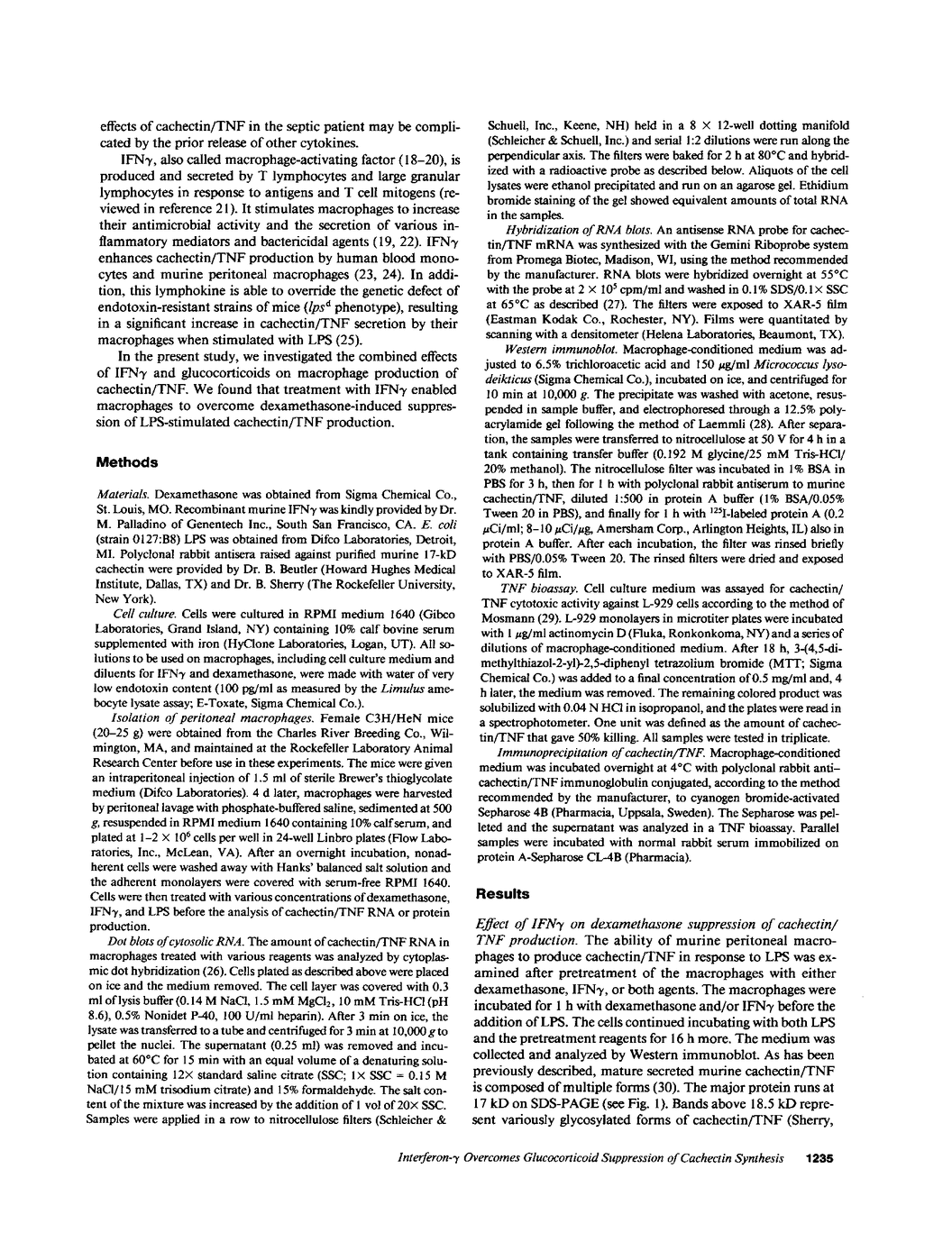 Glucocorticoids almost completely inhibit the synthesis by isolated macrophages of cachectin/tumor necrosis factor (TNF), a cytokine implicated as a major endogenous mediator of septic shock. Despite this in vitro effectiveness, the clinical use of glucocorticoids has failed to demonstrate any clear benefit in the treatment of septic shock. In an effort to understand what other mechanisms might play a role in the patient with sepsis, we examined the effect of interferon-gamma (IFN gamma) on the synthesis of cachectin/TNF. We show here that IFN gamma, although unable by itself to induce cachectin/TNF synthesis, enhanced the endotoxin-induced production of cachectin/TNF in vitro. Furthermore, IFN gamma overcame the inhibition of cachectin/TNF synthesis caused by the glucocorticoid, dexamethasone. These effects of IFN gamma were accounted for by increased levels of cachectin/TNF mRNA. The in vivo implications of these studies are discussed with emphasis on their relevance in human sepsis.