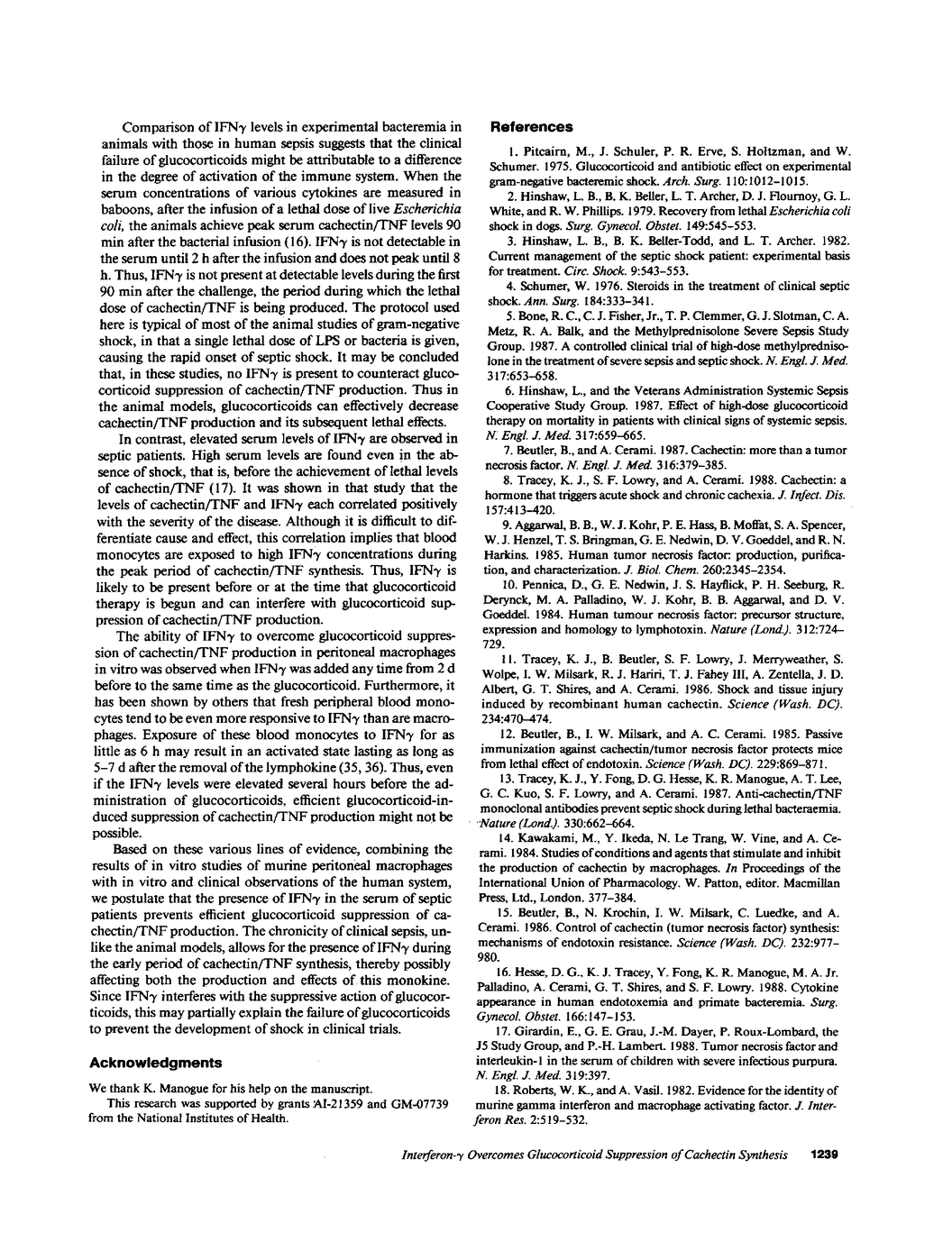 Glucocorticoids almost completely inhibit the synthesis by isolated macrophages of cachectin/tumor necrosis factor (TNF), a cytokine implicated as a major endogenous mediator of septic shock. Despite this in vitro effectiveness, the clinical use of glucocorticoids has failed to demonstrate any clear benefit in the treatment of septic shock. In an effort to understand what other mechanisms might play a role in the patient with sepsis, we examined the effect of interferon-gamma (IFN gamma) on the synthesis of cachectin/TNF. We show here that IFN gamma, although unable by itself to induce cachectin/TNF synthesis, enhanced the endotoxin-induced production of cachectin/TNF in vitro. Furthermore, IFN gamma overcame the inhibition of cachectin/TNF synthesis caused by the glucocorticoid, dexamethasone. These effects of IFN gamma were accounted for by increased levels of cachectin/TNF mRNA. The in vivo implications of these studies are discussed with emphasis on their relevance in human sepsis.