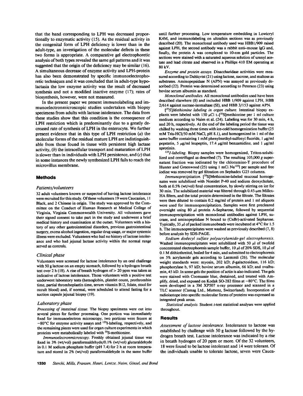 Enzymatic activity, biosynthesis, and maturation of lactasephlorizin hydrolase (LPH) were investigated in adult volunteers with suspected lactose intolerance. Mean LPH activity in jejunal biopsy homogenates of these individuals was 31% compared to LPH-persistent individuals, and was accompanied by a reduced level of LPH-protein. Mean sucrase activity in individuals with low LPH was increased to 162% and was accompanied by an increase in sucrase-isomaltase (SI)-protein. Biosynthesis of LPH, SI, and aminopeptidase N (APN) was studied in organ culture of small intestinal biopsy specimens. In individuals with LPH restriction, the rate of synthesis of LPH was drastically decreased, reaching just 6% of the LPH-persistent group after 20 h of culture, while the rate of synthesis of SI appeared to be increased. In addition, maturation of pro-LPH to mature LPH occurred at a slower rate in LPH-restricted tissue. Immunoelectron microscopy revealed an accumulation of immunoreactive LPH in the Golgi region of enterocytes from LPH-restricted individuals and reduced labeling of microvillus membranes. Therefore, lactose intolerance in adults is mainly due to a decreased biosynthesis of LPH, either at the transcriptional or translational level. In addition, intracellular transport and maturation is retarded in some of the LPH-restricted individuals, and this leads to an accumulation of newly synthesized LPH in the Golgi and a failure of LPH to reach the microvillus membrane.