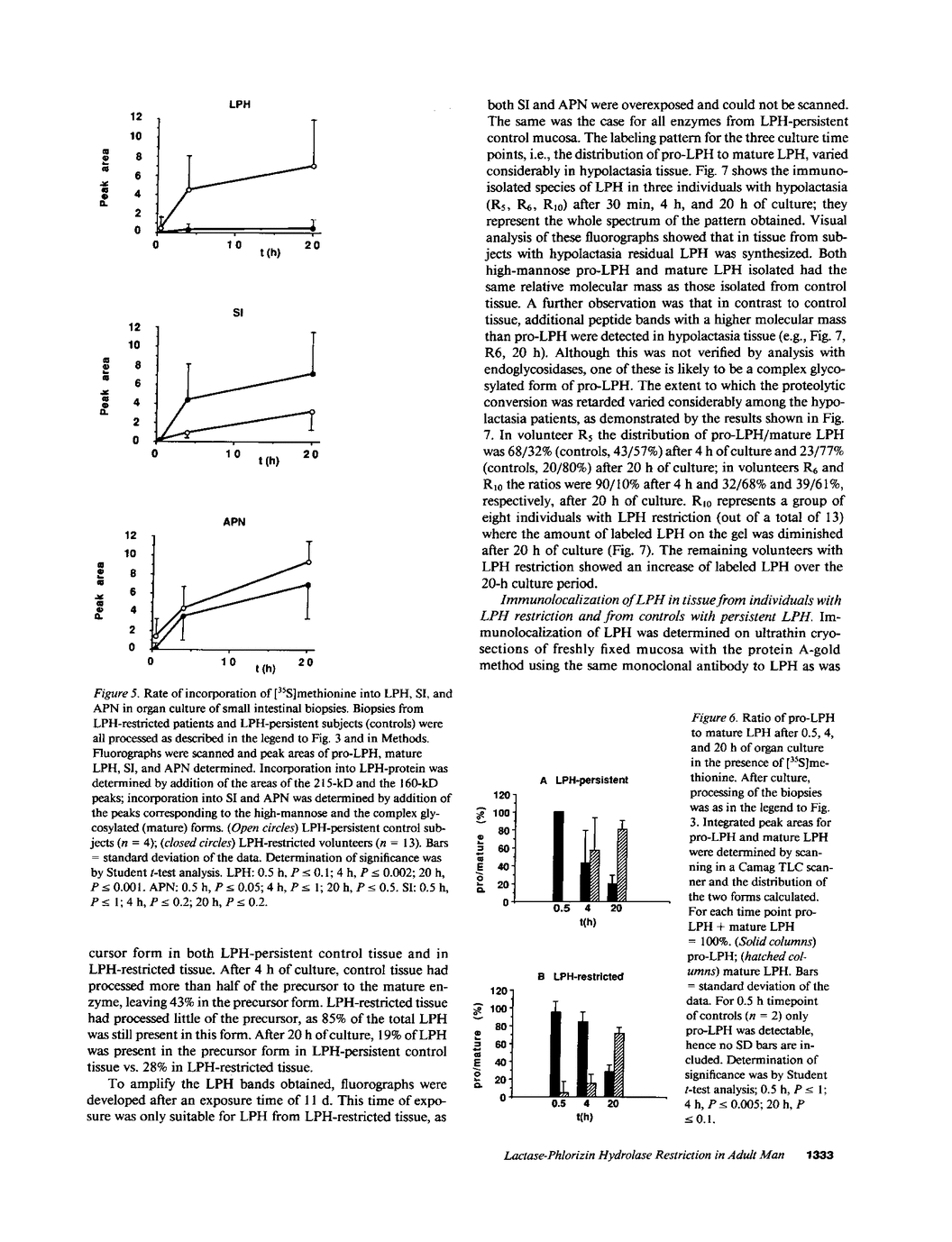 Enzymatic activity, biosynthesis, and maturation of lactasephlorizin hydrolase (LPH) were investigated in adult volunteers with suspected lactose intolerance. Mean LPH activity in jejunal biopsy homogenates of these individuals was 31% compared to LPH-persistent individuals, and was accompanied by a reduced level of LPH-protein. Mean sucrase activity in individuals with low LPH was increased to 162% and was accompanied by an increase in sucrase-isomaltase (SI)-protein. Biosynthesis of LPH, SI, and aminopeptidase N (APN) was studied in organ culture of small intestinal biopsy specimens. In individuals with LPH restriction, the rate of synthesis of LPH was drastically decreased, reaching just 6% of the LPH-persistent group after 20 h of culture, while the rate of synthesis of SI appeared to be increased. In addition, maturation of pro-LPH to mature LPH occurred at a slower rate in LPH-restricted tissue. Immunoelectron microscopy revealed an accumulation of immunoreactive LPH in the Golgi region of enterocytes from LPH-restricted individuals and reduced labeling of microvillus membranes. Therefore, lactose intolerance in adults is mainly due to a decreased biosynthesis of LPH, either at the transcriptional or translational level. In addition, intracellular transport and maturation is retarded in some of the LPH-restricted individuals, and this leads to an accumulation of newly synthesized LPH in the Golgi and a failure of LPH to reach the microvillus membrane.