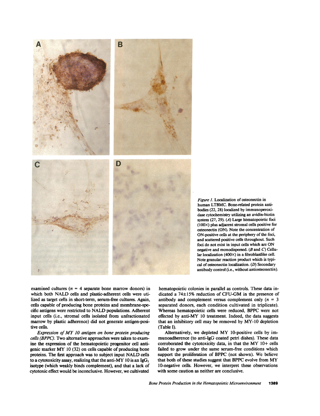Given the intimate relationship between bone and bone marrow, we hypothesized that the human bone marrow may function as a source (or reservoir) of bone-forming progenitor cells. We observed a population of cells within the bone marrow which produce bone-specific or bone-related proteins. The production of these proteins was developmentally regulated in human long-term bone marrow cell cultures; the bone protein-producing cells (BPPC) are observed under serum-free, short-term culture conditions, respond to bone-related and not hematopoietic growth factors, and are derived from a population of low-density, nonadherent, My10-negative (or low My10 density), marrow cells (My10 is an antigen found on most hematopoietic progenitor cells). Cultivation of marrow-derived BPPC in secondary, serum-containing cultures results in their differentiation into osteoblastlike cells. At this stage of development, BPPC produce an extracellular matrix which incorporates both bone-related proteins and radiolabeled calcium. Human bone marrow BPPC thus represent a newly described cell phenotype important to both bone and hematopoietic cell biology.