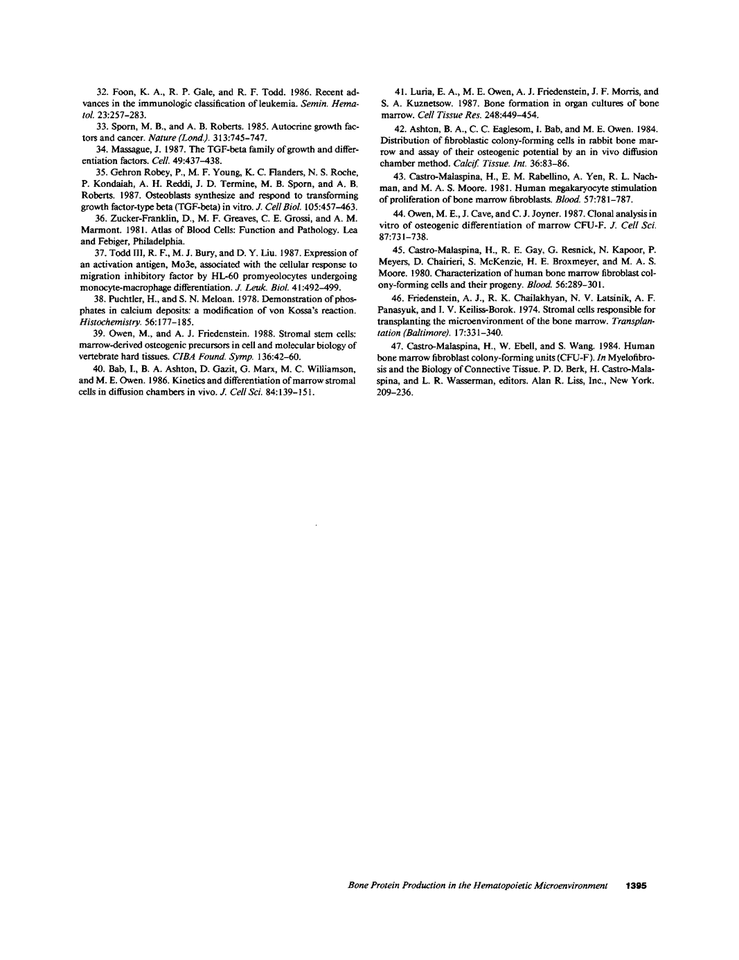 Given the intimate relationship between bone and bone marrow, we hypothesized that the human bone marrow may function as a source (or reservoir) of bone-forming progenitor cells. We observed a population of cells within the bone marrow which produce bone-specific or bone-related proteins. The production of these proteins was developmentally regulated in human long-term bone marrow cell cultures; the bone protein-producing cells (BPPC) are observed under serum-free, short-term culture conditions, respond to bone-related and not hematopoietic growth factors, and are derived from a population of low-density, nonadherent, My10-negative (or low My10 density), marrow cells (My10 is an antigen found on most hematopoietic progenitor cells). Cultivation of marrow-derived BPPC in secondary, serum-containing cultures results in their differentiation into osteoblastlike cells. At this stage of development, BPPC produce an extracellular matrix which incorporates both bone-related proteins and radiolabeled calcium. Human bone marrow BPPC thus represent a newly described cell phenotype important to both bone and hematopoietic cell biology.