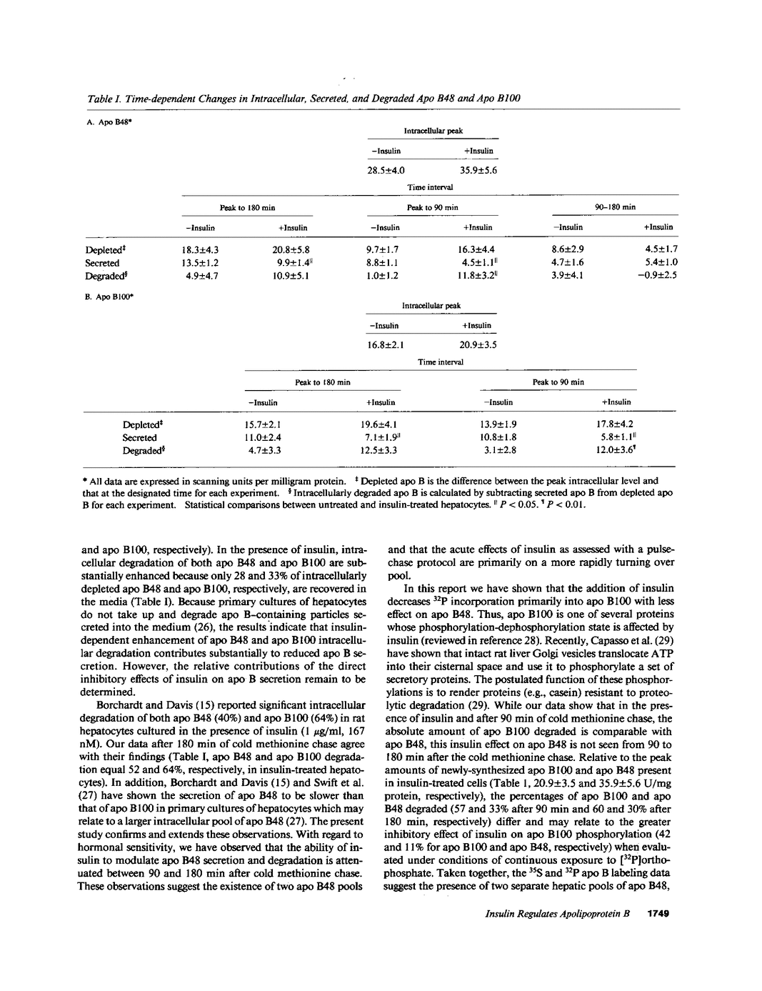 Our laboratory has previously shown that insulin inhibits the secretion of newly-synthesized and immunoreactive apo B from rat hepatocytes. We have also shown that apo B is secreted as a phosphoprotein and that phosphorylation is increased in hypoinsulinemic nonketotic diabetes. The present studies were conducted to determine whether the ability of insulin to inhibit apo B secretion is related to alterations in apo B turnover and whether insulin itself affects apo B phosphorylation. Pulse-chase studies with [35S]methionine in primary cultures of hepatocytes from normal rats in the absence and presence of insulin show that the secretion of apo B100 and apo B48 are inhibited by insulin and that this inhibition may be due in part to enhanced intracellular degradation. In addition, there is a second intracellular apo B48 pool which is not insulin regulated or degraded. In experiments in which hepatocytes were incubated with [32P]orthophosphate, insulin decreased 32P incorporation into apo B100 (42%) with only small effects on apo B48 (11%). The small insulin effect on apo B48 may relate to an insulin-insensitive apo B48 intracellular pool. These studies show that insulin can affect the intracellular turnover, secretion, degradation, and phosphorylation of apo B and emphasize the differential regulation of apo B100 and apo B48 with regard to these parameters in rat liver.