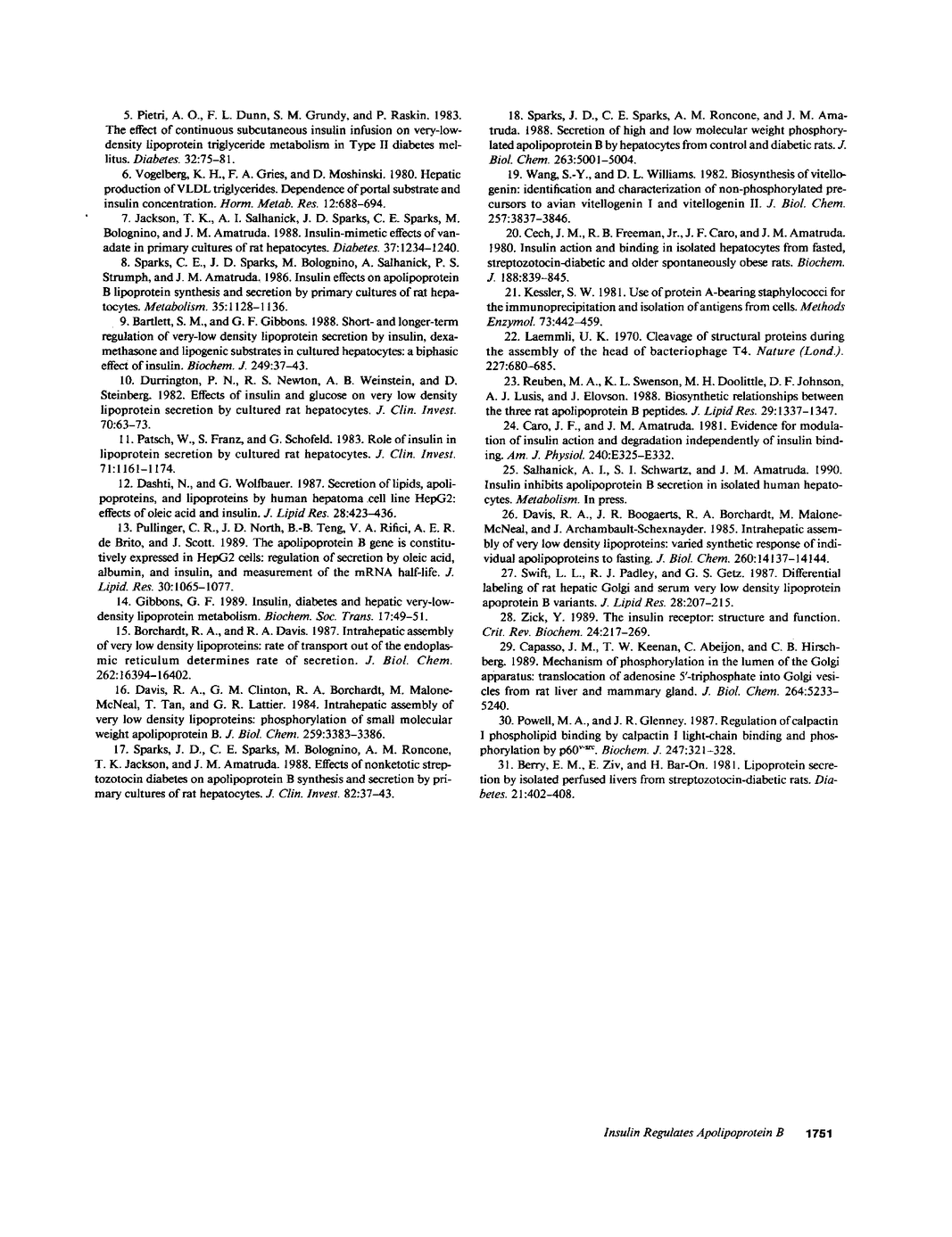 Our laboratory has previously shown that insulin inhibits the secretion of newly-synthesized and immunoreactive apo B from rat hepatocytes. We have also shown that apo B is secreted as a phosphoprotein and that phosphorylation is increased in hypoinsulinemic nonketotic diabetes. The present studies were conducted to determine whether the ability of insulin to inhibit apo B secretion is related to alterations in apo B turnover and whether insulin itself affects apo B phosphorylation. Pulse-chase studies with [35S]methionine in primary cultures of hepatocytes from normal rats in the absence and presence of insulin show that the secretion of apo B100 and apo B48 are inhibited by insulin and that this inhibition may be due in part to enhanced intracellular degradation. In addition, there is a second intracellular apo B48 pool which is not insulin regulated or degraded. In experiments in which hepatocytes were incubated with [32P]orthophosphate, insulin decreased 32P incorporation into apo B100 (42%) with only small effects on apo B48 (11%). The small insulin effect on apo B48 may relate to an insulin-insensitive apo B48 intracellular pool. These studies show that insulin can affect the intracellular turnover, secretion, degradation, and phosphorylation of apo B and emphasize the differential regulation of apo B100 and apo B48 with regard to these parameters in rat liver.