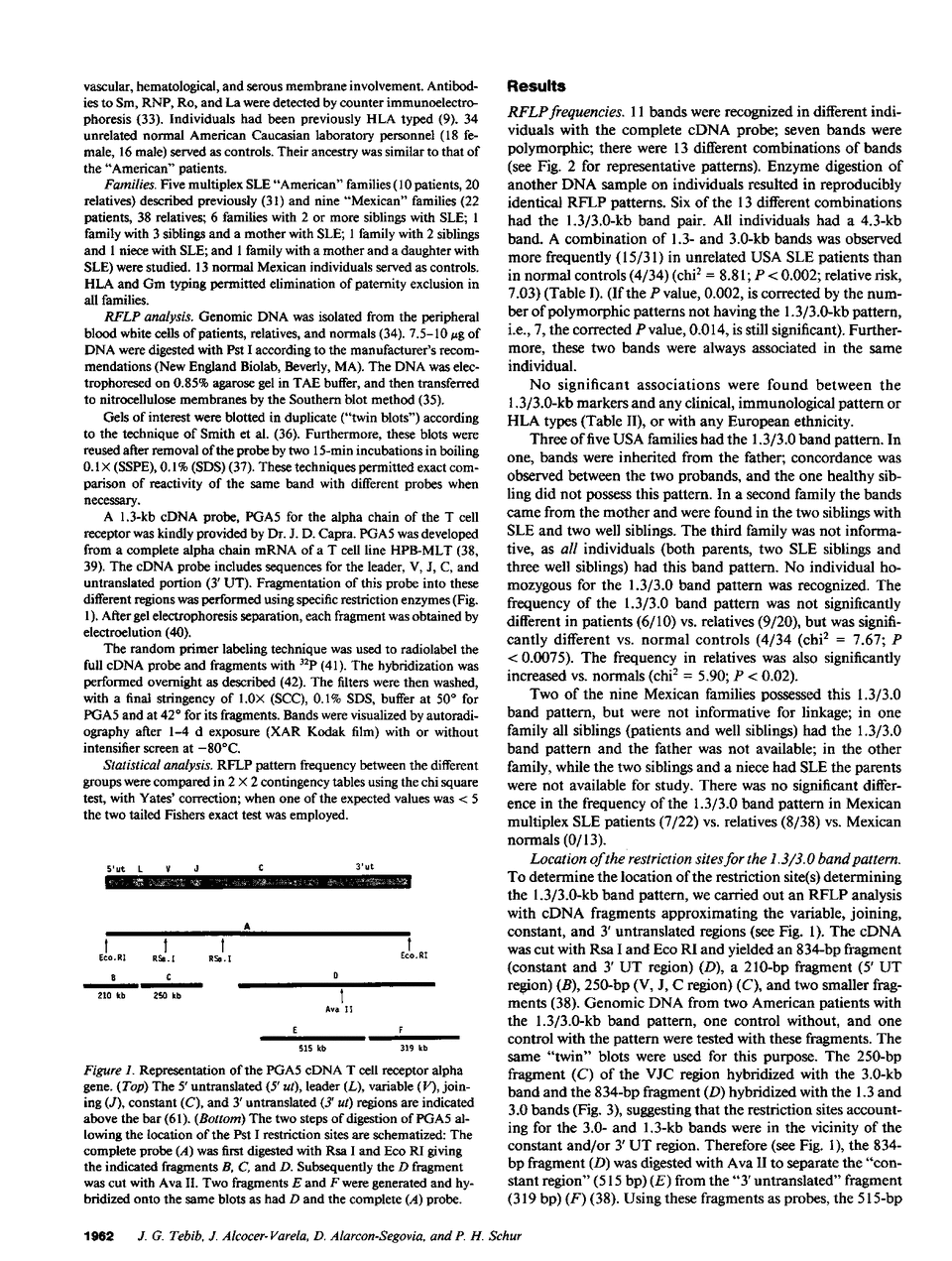 The present study was designed to test the possibility that T cell receptor genes are associated/linked to those involved in systemic lupus erythematosus (SLE). Genomic DNA was isolated from 31 unrelated Caucasian SLE patients, 34 unrelated Caucasian normals, 5 multiplex American Caucasian SLE families, 9 multiplex Mexican SLE families, and 13 unrelated Mexican normals. The DNA was digested with Pst I, electrophoresed, and transferred to membranes by the Southern blot method. The blots were probed with a cDNA probe for the alpha chain of the T cell receptor. 13 polymorphic RFLP patterns were recognized. 1.3- and 3.0-kb band pairs were observed in 15 of 31 of American Caucasian patients and 4 of 34 American Caucasian controls (chi square, 8.81; P less than 0.002; relative risk, 7); there was no association of any RFLP pattern with Mexican SLE. The cDNA probe was cut with Rsa I, EcoR I, and Ava II into fragments corresponding to the V, J, C, and 3'UT regions. Only the fragment corresponding to the constant region reacted with the 1.3/3.0-kb band pair. These observations suggest that a genetic marker of the constant region of the alpha chain of the T cell receptor is associated with genes involved in SLE.
