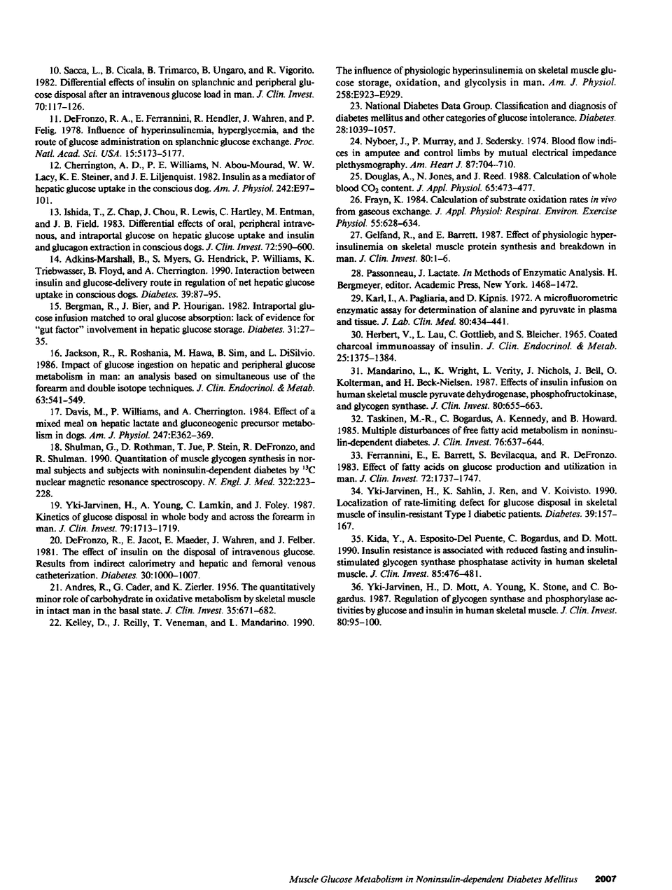 The diminished ability of insulin to promote glucose disposal and storage in muscle has been ascribed to impaired activation of glycogen synthase (GS). It is possible that decreased glucose storage could occur as a consequence of decreased glucose uptake, and that GS is impaired secondarily. Muscle glucose uptake in 15 diabetic subjects was matched to 15 nondiabetic subjects by maintaining fasting hyperglycemia during infusion of insulin. Leg muscle glucose uptake, glucose oxidation (local indirect calorimetry), release of glycolytic products, and muscle glucose storage, as well as muscle GS and pyruvate dehydrogenase (PDH) were determined before and during insulin infusion. Basal leg glucose oxidation and PDH were increased in the diabetics. Insulin-stimulated leg glucose uptake in the diabetics (8.05 +/- 1.41 mumol/[min.100 ml leg tissue]) did not differ from controls (5.64 +/- 0.37). Insulin-stimulated leg glucose oxidation, nonoxidized glycolysis, and glucose storage (2.48 +/- 0.27, 0.68 +/- 0.15, and 5.04 +/- 1.34 mumol/[min.100 ml], respectively) were not different from controls (2.18 +/- 0.12, 0.62 +/- 0.16, and 2.83 +/- 0.31). PDH and GS in noninsulin-dependent diabetes mellitus (NIDDM) were also normal during insulin infusion. When diabetics were restudied after being rendered euglycemic by overnight insulin infusion, GS and PDH were reduced compared with hyperglycemia. Thus, fasting hyperglycemia is sufficient to normalize insulin-stimulated muscle glucose uptake in NIDDM, and glucose is distributed normally to glycogenesis and glucose oxidation, possibly by normalization of GS and PDH.