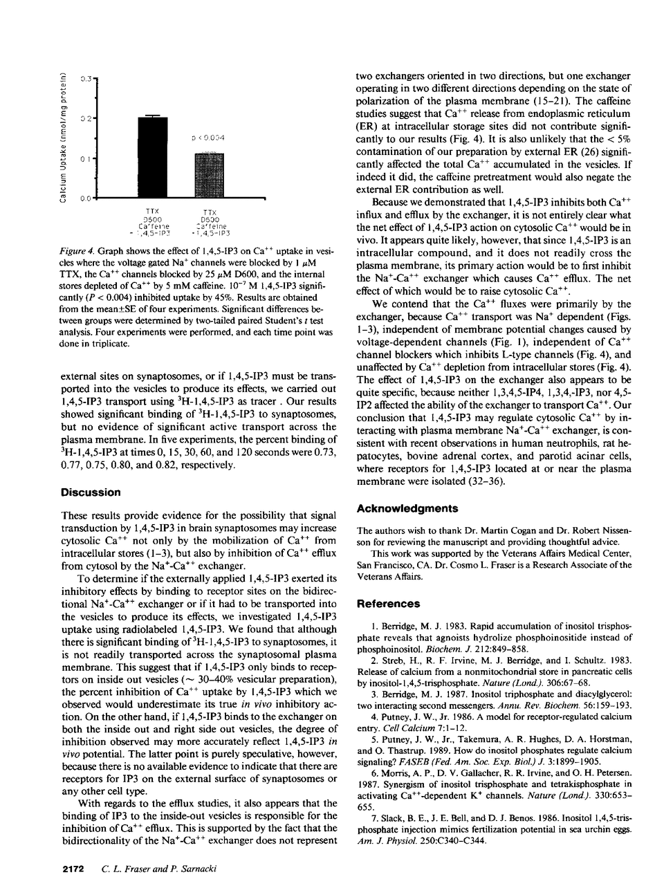 The role of inositol 1,4,5-trisphosphate (1,4,5-IP3) in regulating cytosolic Ca++ by stimulating Ca++ release from intracellular organelles is well established. However, other modes of intracellular Ca++ regulation by 1,4,5-IP3 have not been determined. To determine if 1,4,5-IP3 may regulate cell cytosolic Ca++ by acting on plasma membrane bound Na(+)-Ca++ exchanger, we investigated Ca++ transport in synaptosomes using 45Ca++ as tracer. In the presence of either an inhibitor of voltage gated Na+ channels (tetrodotoxin) or the K+ ionophore (valinomycin), Ca++ uptake was significantly inhibited (P less than 0.05) by 1,4,5-IP3 in a concentration dependent manner, with half-maximal inhibition occurring at submicromolar concentrations between 10(-9) M and 10(-10) M 1,4,5-IP3. Similarly, Ca++ efflux by the exchanger was significantly inhibited 40% by 1,4,5-IP3. The inhibitory effect of 1,4,5-IP3 on the Na(+)-Ca++ exchanger was observed in the presence of Ca++ channel blockers, and in vesicles pretreated with caffeine to deplete the 1,4,5-IP3-sensitive stores of Ca++. These results suggest that during signal transduction in brain, 1,4,5-IP3 may increase cytosolic [Ca++] in part by inhibiting the Na(+)-Ca++ exchanger and thus, Ca++ efflux from cell.