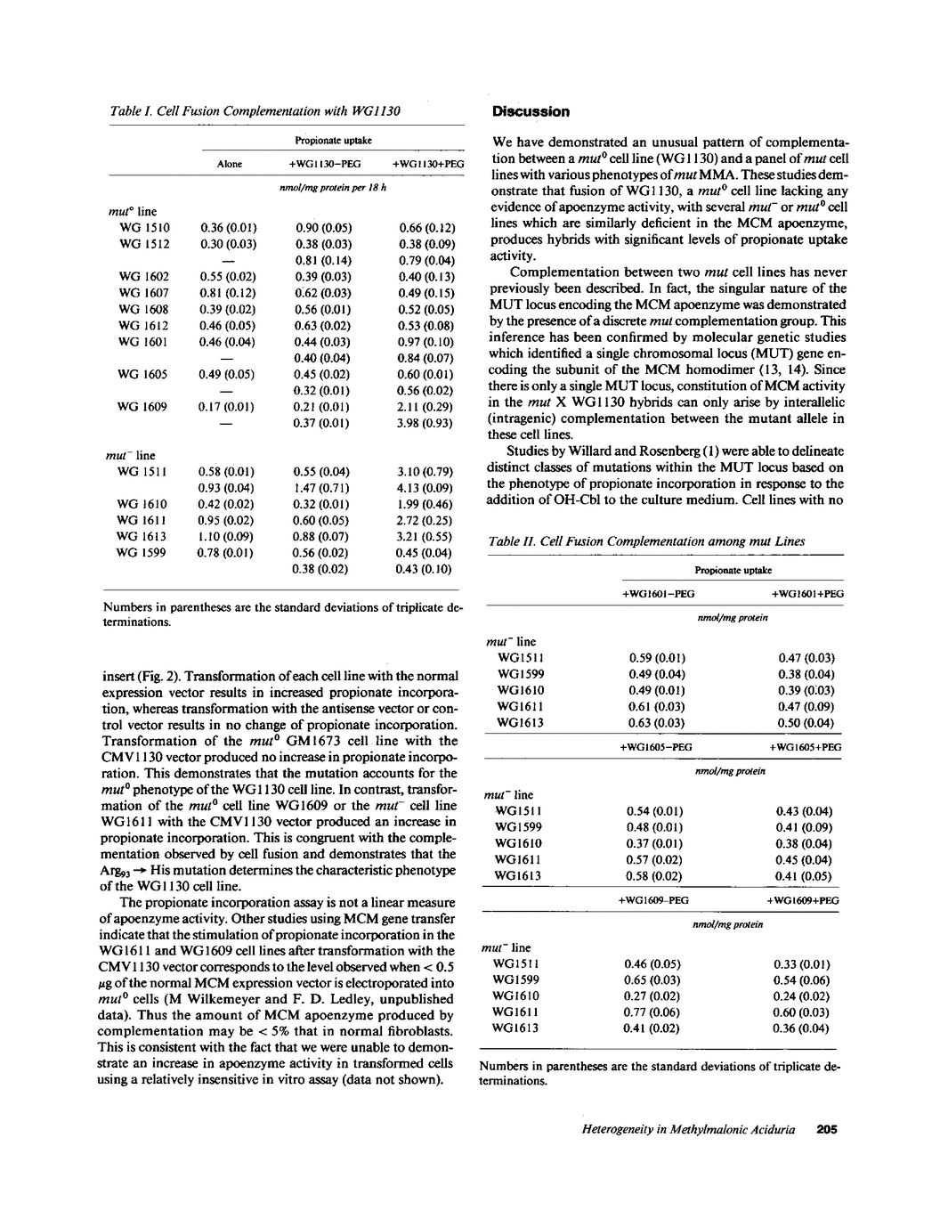 Genetic complementation of fibroblasts from patients with methylmalonic aciduria (MMA) defines a unique class of allelic mutations arising from mutations at the locus encoding the methylmalonyl coenzyme A (CoA) mutase apoenzyme. Various phenotypes of MMA have been delineated including complete absence of enzyme activity (mut0) and abnormal enzyme activity with an elevated Km for adenosylcobalamin (mut-). We describe genetic studies on a cell line (WG1130) from a patient with mut0 MMA which exhibited an unusual complementation phenotype, complementing with three of nine mut0 cell lines and four of five mut- cell lines. This suggests that interallelic complementation occurs between mutant alleles in WG1130 and subsets of alleles associated with both mut0 and mut- phenotypes. The methylmalonyl CoA mutase cDNA was cloned from WG1130 and found to contain a G354----A (Arg93----His) mutation. Gene transfer of this mutant clone into primary fibroblasts from patients with MMA confirms that this mutation expresses a mut0 phenotype when transferred into a mut0 cell line with low levels of mRNA but can contribute to apoenzyme function when transferred into mut cell lines which show correction with WG1130 by somatic cell complementation. These results point to further heterogeneity within both mut0 and mut- and may enable identification of mutations affecting discrete components of apoenzyme function.