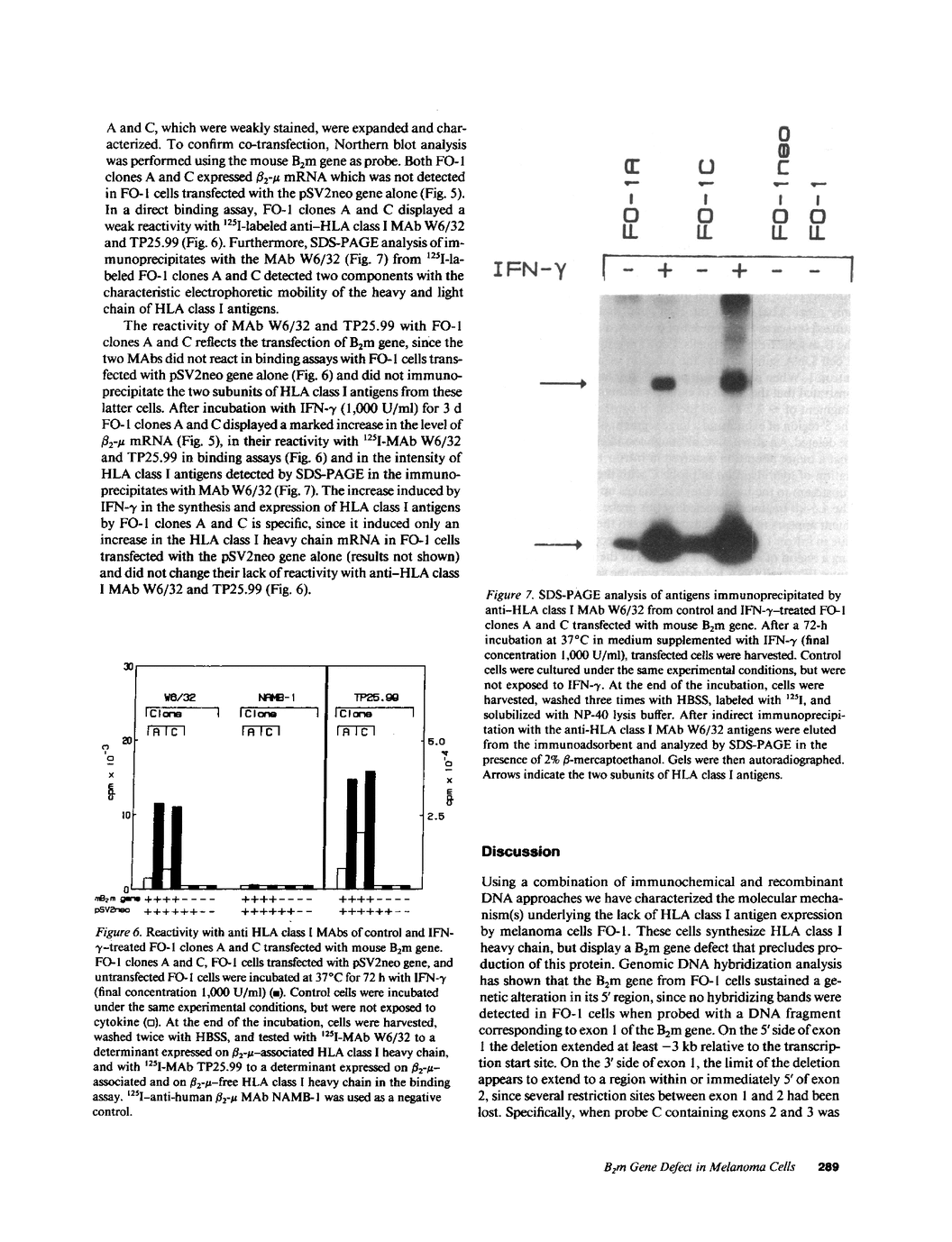The melanoma cell line FO-1 does not express HLA class I antigens and does not acquire them on the cell surface after incubation with IFN-gamma. Immunochemical studies showed that FO-1 cells synthesize HLA class I heavy chain, but do not synthesize beta 2-microglobulin (beta 2-mu). The latter abnormality is associated with lack of beta 2-mu mRNA which remains undetectable in FO-1 cells incubated with IFN-gamma. The defect was identified as a genetic lesion in the B2m gene, since DNA hybridization analysis detected a deletion of the first exon of the 5'-flanking region, and of a segment of the first intron of the B2m gene. HLA class I antigen expression was reconstituted on melanoma cells FO-1 after transfection with the wild-type mouse B2m gene, thereby confirming the abnormality of the endogenous B2m gene. The defect identified in FO-1 cells is distinct from that underlying the lack of HLA class I antigen expression by lymphoblastoid cells Daudi, but is remarkably similar to that causing lack of H-2 class I antigen expression by mouse lymphoblastoid cells R1 (TL-). These results suggest that genetic recombination in the 5' region of the B2m gene is a recurrent mechanism in B2m gene defects. In addition to contributing to our understanding of molecular abnormalities in HLA class I antigen expression by melanoma cells, FO-1 cells represent a useful model for analyzing the role of HLA class I antigens in the biology of melanoma cells and in their interaction with cells of the immune system.
