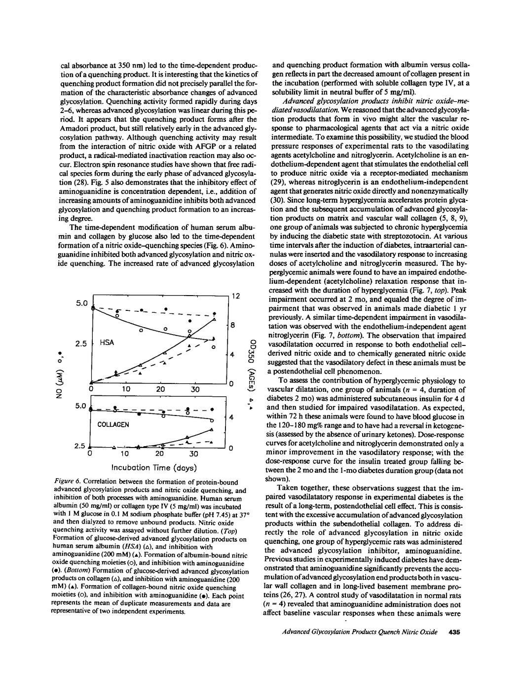 Nitric oxide (an endothelium-derived relaxing factor) induces smooth muscle relaxation and is an important mediator in the regulation of vascular tone. Advanced glycosylation end products, the glucose-derived moieties that form nonenzymatically and accumulate on long-lived tissue proteins, have been implicated in many of the complications of diabetes and normal aging. We demonstrate that advanced glycosylation products quench nitric oxide activity in vitro and in vivo. Acceleration of the advanced glycosylation process in vivo results in a time-dependent impairment in endothelium-dependent relaxation. Inhibition of advanced glycosylation with aminoguanidine prevents nitric oxide quenching, and ameliorates the vasodilatory impairment. These results implicate advanced glycosylation products as important modulators of nitric oxide activity and endothelium-dependent relaxation.