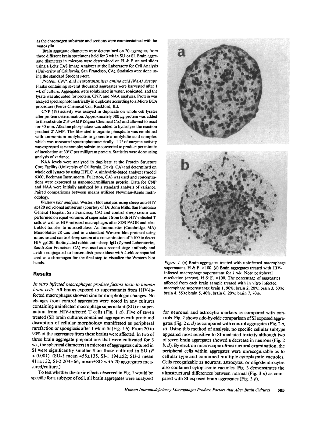 We wanted to establish an in vitro human model for AIDS-associated dementia and pursue the hypothesis that this disease process may be a result of soluble factors produced by HIV-infected macrophages. Human brain aggregates were prepared from nine different brain specimens, and were treated with supernatants from in vitro HIV-infected macrophages (SI), uninfected macrophages (SU), infected T cells, or macrophage-conditioned media from four AIDS patients. Seven of nine treated brains exposed to SI showed peripheral rarefaction after 1 wk of incubation that by ultrastructural analysis showed cytoplasmic vacuolation. Aggregates from two of three brain cultures treated with SI for 3 wk became smaller, an approximately 50% decrease in size. The degree of apparent toxicity in brains exposed to patient-derived macrophage supernatants paralleled the proportion of macrophages found to be expressing HIV p24. Ultrastructural abnormalities were not observed in brains treated with supernatants from HIV-infected T cells, uninfected macrophages, or LPS-activated macrophages. Levels of five neurotransmitter amino acids were decreased in comparison to the structural amino acid leucine. These findings suggest that HIV-infected macrophages, infected both in vitro as well as derived from AIDS patients' peripheral blood, produce factors that cause reproducible histochemical, ultrastructural, and functional abnormalities in human brain aggregates.
