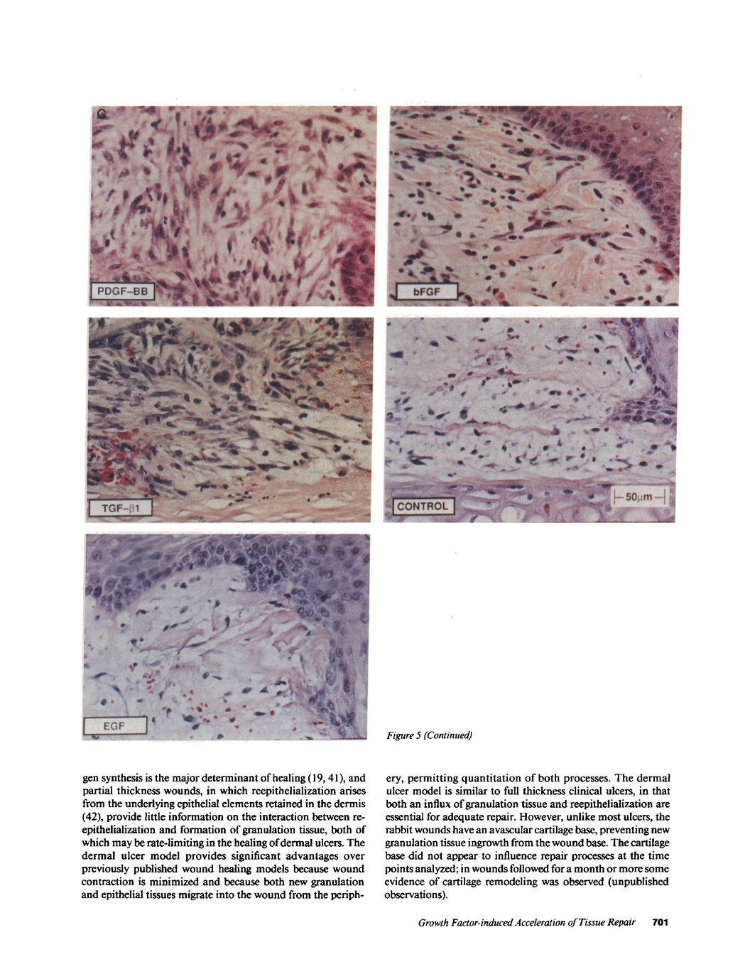 The roles of polypeptide growth factors in promoting wound healing and in directing the specificity and sequence of responses of different tissues in wounds are little understood. We investigated the influence of four growth factors on the rates of healing of a novel full thickness dermal ulcer placed on an avascular base in the rabbit ear. The wound model precludes significant wound contraction and requires new granulation tissue and epithelial cells for healing to originate centripetally. 5 micrograms (7-31 pmol/mm2) of platelet-derived growth factor-B chain (PDGF-BB), basic fibroblast growth factor (bFGF), and epidermal growth factor (EGF) applied locally at the time of wounding resulted in a twofold increase in complete reepithelialization of treated wounds (PDGF-BB, P = 0.02 chi square analysis; bFGF, P = 0.04; EGF, P = 0.05); transforming growth factor (TGF)-beta 1 significantly inhibited reepithelialization (P = 0.05). Both PDGF-BB and TGF-beta 1 uniquely increased the depth and area of new granulation tissue (P less than 0.005), the influx of fibroblasts, and the deposition of new matrix into wounds. Explants from 7-d old PDGF-BB-treated wounds remained metabolically far more active than controls, incorporating 473% more [3H]thymidine into DNA (P = 0.05) and significantly more [3H]leucine and [3H]proline into collagenase-sensitive protein (P = 0.04). The results establish that polypeptide growth factors have significant and selective positive influences on healing of full thickness ulcers in the rabbit.