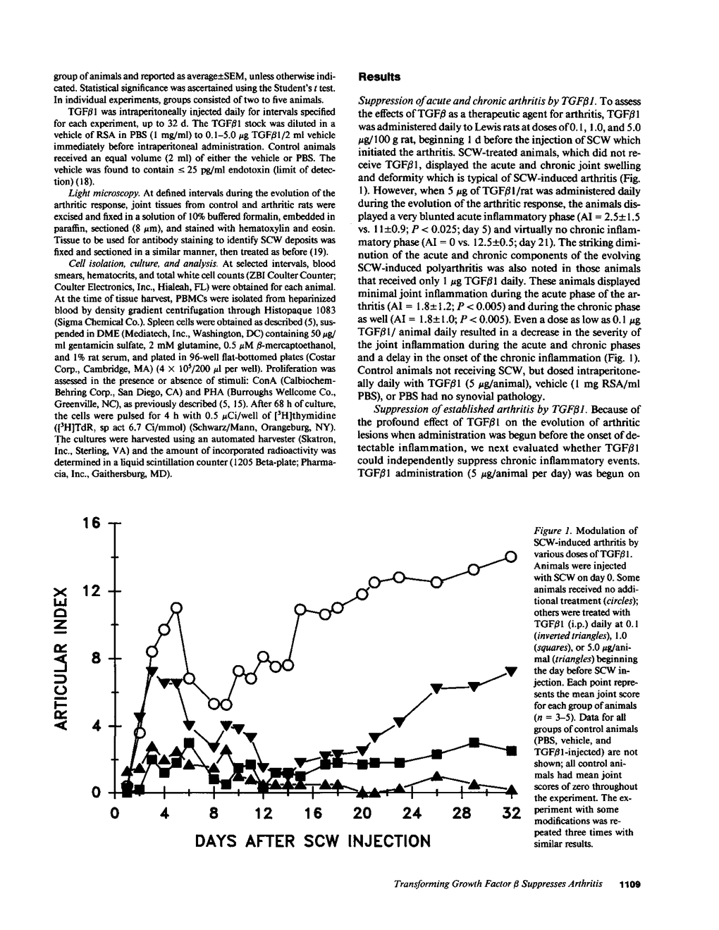 Systemic administration of the cytokine, TGF beta 1, profoundly antagonized the development of polyarthritis in susceptible rats. TGF beta 1 administration (1 or 5 micrograms/animal), initiated one day before an arthritogenic dose of streptococcal cell wall (SCW) fragments, virtually eliminated the joint swelling and distortion typically observed during both the acute phase (articular index, AI = 2.5 vs. 11; P less than 0.025) and the chronic phase (AI = 0 vs. 12.5) of the disease. Moreover, TGF beta 1 suppressed the evolution of arthritis even when administration was begun after the acute phase of the disease. Histopathological examination of the joint revealed the systemic TGF beta 1 treatment greatly reduced inflammatory cell infiltration, pannus formation, and joint erosion. Consistent with the inhibition of inflammatory cell recruitment into the synovium, TGF beta 1 reversed the leukocytosis associated with the chronic phase of the arthritis. Control animals subjected to the same TGF beta 1 dosing regimen displayed no discernable immunosuppressive or toxic effects even after 4 wk of treatment. These observations not only provide insight into the immunoregulatory effects of TGF beta, but also implicate this cytokine as a potentially important therapeutic agent.