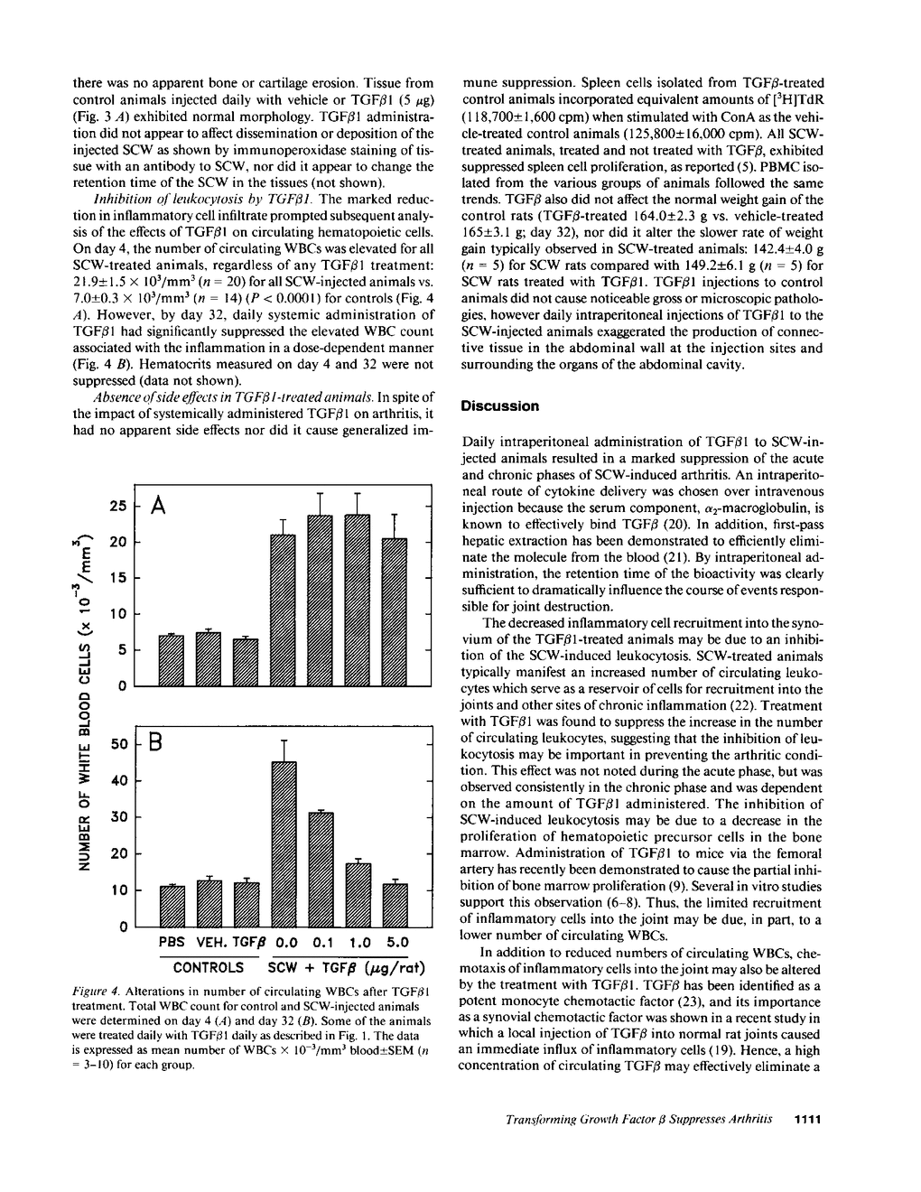 Systemic administration of the cytokine, TGF beta 1, profoundly antagonized the development of polyarthritis in susceptible rats. TGF beta 1 administration (1 or 5 micrograms/animal), initiated one day before an arthritogenic dose of streptococcal cell wall (SCW) fragments, virtually eliminated the joint swelling and distortion typically observed during both the acute phase (articular index, AI = 2.5 vs. 11; P less than 0.025) and the chronic phase (AI = 0 vs. 12.5) of the disease. Moreover, TGF beta 1 suppressed the evolution of arthritis even when administration was begun after the acute phase of the disease. Histopathological examination of the joint revealed the systemic TGF beta 1 treatment greatly reduced inflammatory cell infiltration, pannus formation, and joint erosion. Consistent with the inhibition of inflammatory cell recruitment into the synovium, TGF beta 1 reversed the leukocytosis associated with the chronic phase of the arthritis. Control animals subjected to the same TGF beta 1 dosing regimen displayed no discernable immunosuppressive or toxic effects even after 4 wk of treatment. These observations not only provide insight into the immunoregulatory effects of TGF beta, but also implicate this cytokine as a potentially important therapeutic agent.