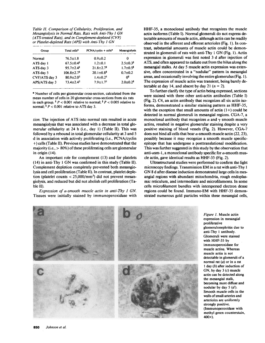 Mesangial cell proliferation is common in glomerulonephritis but it is unclear if proliferation is associated with any in vivo alteration in phenotype. We investigated whether mesangial of mesangial proliferative nephritis induced with antibody to the Thy-1 antigen present on mesangial cells. At day 3 glomeruli displayed de novo immunostaining for alpha-smooth muscle actin in a mesangial pattern, correlating with the onset of proliferation, and persisting until day 14. An increase in desmin and vimentin in mesangial regions was also noted. Immunoelectron microscopy confirmed that the actin-positive cells were mesangial cells, and double immunolabeling demonstrated that the smooth muscle actin-positive cells were actively proliferating. Northern analysis of isolated glomerular RNA confirmed an increase in alpha and beta/gamma actin mRNA at days 3 and 5. Complement depletion or platelet depletion prevented or reduced proliferation, respectively; these maneuvers also prevented smooth muscle actin and actin gene expression. Studies of five other experimental models of nephritis confirmed that smooth muscle actin expression is a marker for mesangial cell injury. Thus, mesangial cell proliferation in glomerulonephritis in the rat is associated with a distinct phenotypic change in which mesangial cell assume smooth muscle cell characteristics.