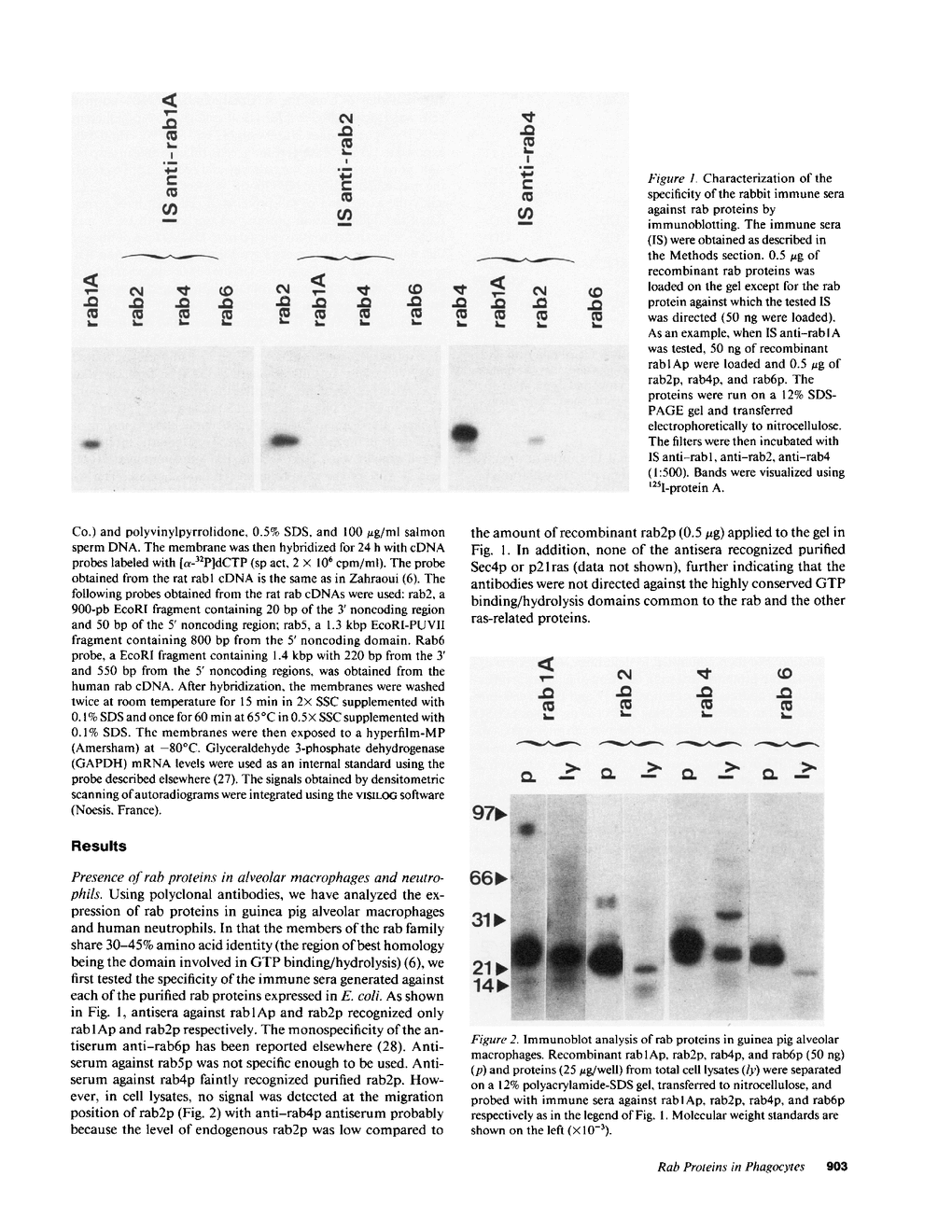 Rab is a newly identified family of small G-proteins that share 35-70% homology with the yeast Sec4p and Ypt1p involved in the regulation of the secretory pathway. Mature phagocytes display functions requiring organized intracellular traffic and, for this reason, we questioned whether phagocyte differentiation could correlate with the increased expression of rab proteins. Rabbit antisera raised against the recombinant proteins rab1Ap, 2p, 4p, and 6p were able to detect the corresponding proteins in the human monoblast leukemic cell line U937. When these cells were induced to differentiate into monocyte/macrophage-like cells displaying functional characteristics of a normal phagocyte, rab1Ap, 2p, 4p, and 6p were increased and this correlated with an increase in the rab transcripts. Using a rab5 probe, we also observed an increased expression of the rab5 gene in differentiated cells. Similarly, differentiation of the human leukemic myeloblast HL60 cell line along either monocyte or granulocyte pathways induced an increased expression of the rab proteins. Rab proteins were also detected in human neutrophils and in guinea pig alveolar macrophages. As degranulation is one of the phagocyte functions acquired in the late stage of differentiation, we investigated whether rab proteins would be involved in this process. Although rab proteins were tightly membrane bound, none of them was detected in the specific or azurophil granules purified from human neutrophils. The increased expression of rab proteins in mature phagocytes suggests that they may promote functions highly developed in these cells.