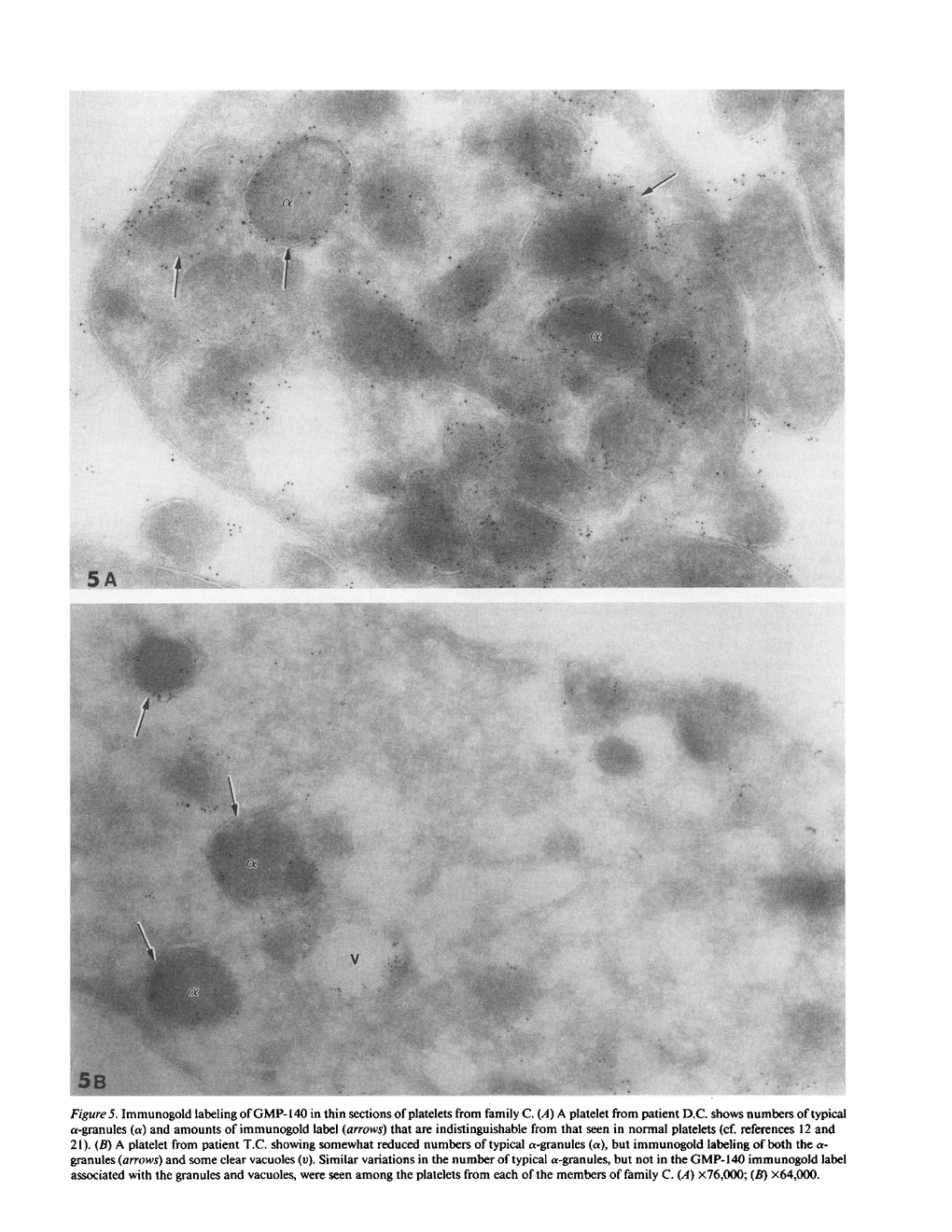 To determine whether alpha-granule membranes are present in platelets of patients with storage pool deficiencies of both alpha and dense granules (alpha delta-SPD), we examined the content and surface expression of the alpha-granule membrane protein GMP-140 in one patient (J.C.) with a severe alpha-granule deficiency and in three members of a family (family C) with milder alpha-granule deficiencies. Surface expression of GMP-140 in stimulated platelets, assessed by flow cytometric measurements of the binding of two anti-GMP-140 monoclonal antibodies, was 24-38% of normal values in platelets from patient J.C., vs. 60-95% of normal values in family C. Total platelet content of GMP-140, determined in platelet lysates by antigen-capture ELISA, was 49% of normal in patient J.C., but normal in the members of family C. Platelets of patient J.C. were found to be heterogeneous with respect to GMP-140 content and surface expression by both flow cytometry and immunogold electron microscopy. Approximately 80% of her platelets expressed little or no GMP-140 after stimulation, whereas the remaining 20% expressed normal amounts of GMP-140 and showed extensive immunogold labeling of typical alpha-granules and clear vacuoles. No such heterogeneity was found in platelets from family C. These findings in the severe alpha delta-SPD patient are in clear contrast to the observations of normal GMP-140 content in the three other alpha delta-SPD patients, and in patients with the gray platelet syndrome, reported previously by others. These results illustrate the phenotypic heterogeneity of alpha-granule deficiencies in human platelets, and suggest that a defect in granule formation in the megakaryocytes may account for the alpha-granule defect in at least one form of alpha delta-SPD.