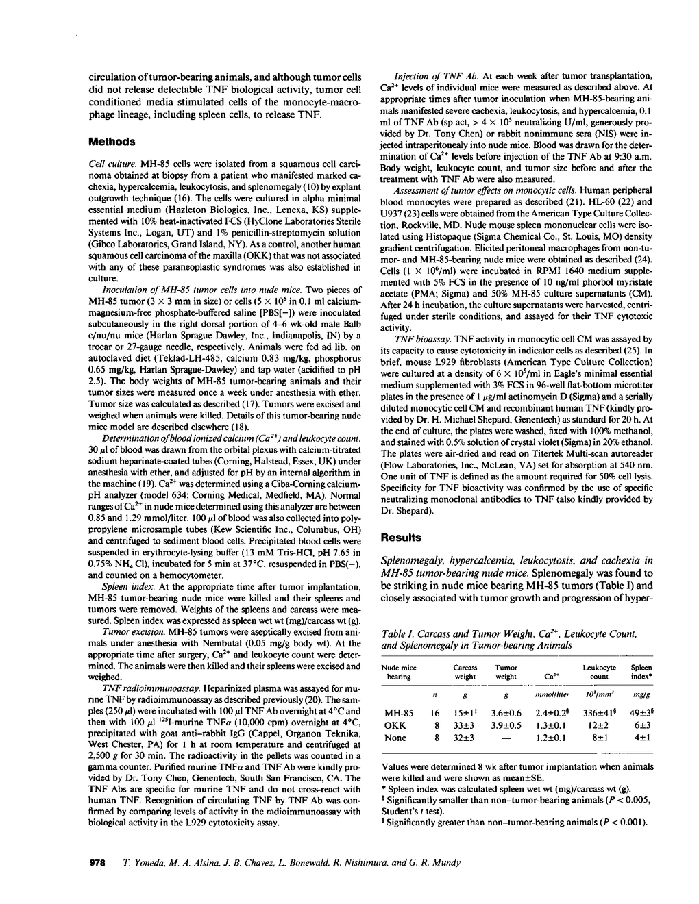 Recently, we have established a human squamous cell carcinoma of the maxilla (called MH-85) associated with hypercalcemia, leukocytosis, and cachexia in culture. MH-85 tumor cells caused the same paraneoplastic syndromes in tumor-bearing nude mice. We found that there was a sixfold increase in splenic size in MH-85 tumor-bearing mice. This increase paralleled tumor growth and was reversed by surgical removal of the tumor. Splenectomy in nude mice 1 wk before or 6 wk after tumor inoculation resulted in a decrease in tumor growth, and impairment of hypercalcemia, leukocytosis, and cachexia. In MH-85 tumor-bearing animals that had been pretreated by splenectomy, intravenous injection of fresh normal spleen cells caused an immediate reversal of leukocytosis, hypercalcemia, and cachexia. Since the presence of cachexia in both the patient and the mice carrying the tumor suggested tumor necrosis factor (TNF) may be overproduced, we injected polyclonal neutralizing antibodies raised against murine TNF into tumor-bearing mice. There was a rapid and reproducible decrease in blood ionized calcium, accompanied by suppression of osteoclast activity. No changes in blood ionized calcium were seen in mice injected with normal immune sera. In addition, there was an increase in body weight and decrease in white cell count. Plasma immunoreactive TNF was increased almost fourfold in tumor-bearing nude mice compared with control nude mice. Although TNF activity was undetectable in MH-85 culture supernatants, cells of the macrophage lineage, including spleen cells, released increased amounts of TNF when cultured with MH-85 tumor-conditioned media. These results suggest that splenic cytokines such as TNF may influence the development of the paraneoplastic syndromes of hypercalcemia, leukocytosis, and cachexia in these animals, as well as tumor growth. They also show that paraneoplastic syndromes may be due to factors produced by normal host cells stimulated by the presence of the tumor.