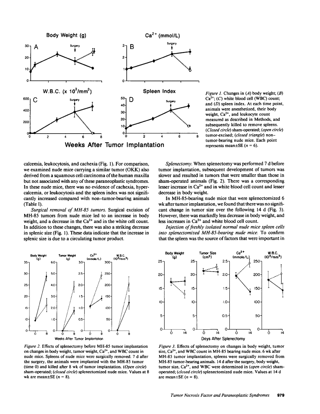 Recently, we have established a human squamous cell carcinoma of the maxilla (called MH-85) associated with hypercalcemia, leukocytosis, and cachexia in culture. MH-85 tumor cells caused the same paraneoplastic syndromes in tumor-bearing nude mice. We found that there was a sixfold increase in splenic size in MH-85 tumor-bearing mice. This increase paralleled tumor growth and was reversed by surgical removal of the tumor. Splenectomy in nude mice 1 wk before or 6 wk after tumor inoculation resulted in a decrease in tumor growth, and impairment of hypercalcemia, leukocytosis, and cachexia. In MH-85 tumor-bearing animals that had been pretreated by splenectomy, intravenous injection of fresh normal spleen cells caused an immediate reversal of leukocytosis, hypercalcemia, and cachexia. Since the presence of cachexia in both the patient and the mice carrying the tumor suggested tumor necrosis factor (TNF) may be overproduced, we injected polyclonal neutralizing antibodies raised against murine TNF into tumor-bearing mice. There was a rapid and reproducible decrease in blood ionized calcium, accompanied by suppression of osteoclast activity. No changes in blood ionized calcium were seen in mice injected with normal immune sera. In addition, there was an increase in body weight and decrease in white cell count. Plasma immunoreactive TNF was increased almost fourfold in tumor-bearing nude mice compared with control nude mice. Although TNF activity was undetectable in MH-85 culture supernatants, cells of the macrophage lineage, including spleen cells, released increased amounts of TNF when cultured with MH-85 tumor-conditioned media. These results suggest that splenic cytokines such as TNF may influence the development of the paraneoplastic syndromes of hypercalcemia, leukocytosis, and cachexia in these animals, as well as tumor growth. They also show that paraneoplastic syndromes may be due to factors produced by normal host cells stimulated by the presence of the tumor.