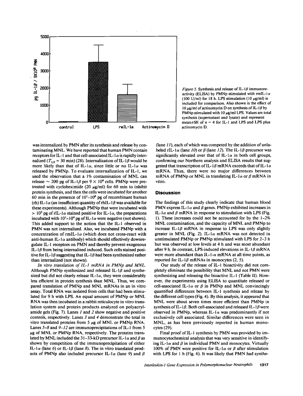 Expression of IL-1 alpha and beta genes was studied in human blood PMN with close monitoring of the effects of contaminating mononuclear leukocytes (MNL). We provide evidence that PMN both transcribe and translate IL-1 alpha and beta genes after stimulation with LPS or IL-1 alpha. A combination of mouse thymocyte comitogen proliferation assay, ELISA, and immunocytochemistry was required to establish that IL-1 alpha and beta synthesis observed in preparations of PMN could not be accounted for by the low level of contaminating MNL. Synthesis of IL-1 beta in PMN exceeded that of IL-1 alpha, but little or no IL-1 alpha was released by PMN. Although increases in IL-1 mRNA after stimulation of PMN and MNL with LPS were similar, PMN were less efficient than MNL in translating IL-1 mRNA. In contrast, PMN and MNL IL-1 alpha and beta mRNAs were translated with equal efficiency in rabbit reticulocyte lysates, suggesting that synthesis of IL-1 in PMN is subject to some form of translational control. We conclude that PMN stimulated with LPS efficiently transcribe but inefficiently translate IL-1 genes relative to MNL. IL-1 beta transcription and translation predominates over that of IL-1 alpha, and IL-1 beta is the predominant IL-1 protein released by PMN. IL-1 can induce its own synthesis in PMN.