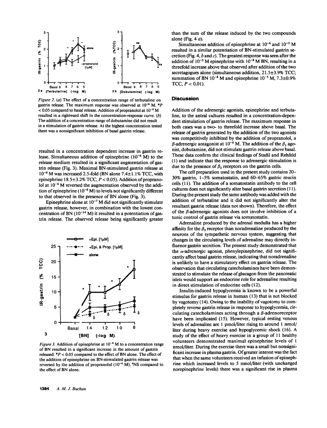 Clinical data indicate that the control of gastrin secretion from the human antrum has a beta-adrenergic component. The purpose of the present study was to investigate whether this was due to the presence of beta-adrenergic receptors on the G cells. A newly developed short-term culture system of enriched antral G cells was used to eliminate the possibility of input from factors in the circulation and the peripheral innervation. The results demonstrated that epinephrine and terbutaline (a beta 2 agonist) significantly stimulated gastrin release above basal which could be blocked by the addition of propranolol (beta-adrenergic antagonist). However, the beta 1 agonist, dobutamine, and phenylepinephrine did not stimulate gastrin release above basal. In addition, simultaneous administration of epinephrine and the neuropeptide, bombesin, resulted in a potentiation of gastrin release. It was concluded that the stimulatory effect of the sympathetic system on gastrin release was mediated through beta 2-adrenergic receptors. The data indicated that adrenaline released from the adrenal medulla and gastrin releasing peptide (the mammalian homolog of bombesin) released from the intrinsic innervation of the stomach interact with respect to the stimulation of gastrin.
