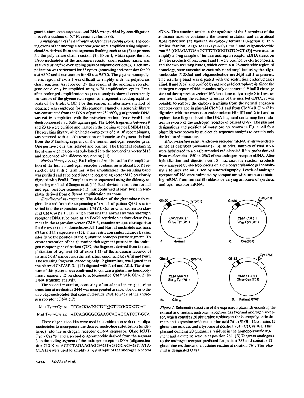 We have examined the nature of the mutant androgen receptor in a family with a severe defect in virilization associated with a qualitative defect in receptor function. The androgen receptor gene in this family contains two structural alterations: a single nucleotide substitution at position 2444 in exon 5 (adenosine----guanosine) that converts tyrosine 761 to a cysteine residue and a shortened glutamine homopolymeric segment in exon 1 that encodes 12 rather than the usual 20-22 glutamines. A family study was performed using polymerase chain reaction amplification of the glutamine-rich segment, and it was shown that the sister of the proband does not carry the mutant allele. The effects of these two mutations on the function of the androgen receptor were studied by introducing the changes, individually and in combination, into cDNAs encoding the normal human androgen receptor and analyzing the receptor protein produced after transfection of the cDNAs into eukaryotic cells. The presence of a cysteine residue at position 761 causes rapid dissociation of dihydrotestosterone from the receptor protein. Marked thermolability of the transfected receptor protein, however, was demonstrable only upon introduction of an androgen receptor cDNA containing both the partial deletion of the glutamine homopolymeric segment and a cysteine residue at position 761. Likewise, the ability of the receptor to stimulate a reporter gene is strikingly diminished only when both alterations are present, suggesting that the shortened glutamine homopolymeric segment amplifies the impairment of receptor function caused by the tyrosine to cysteine substitution.