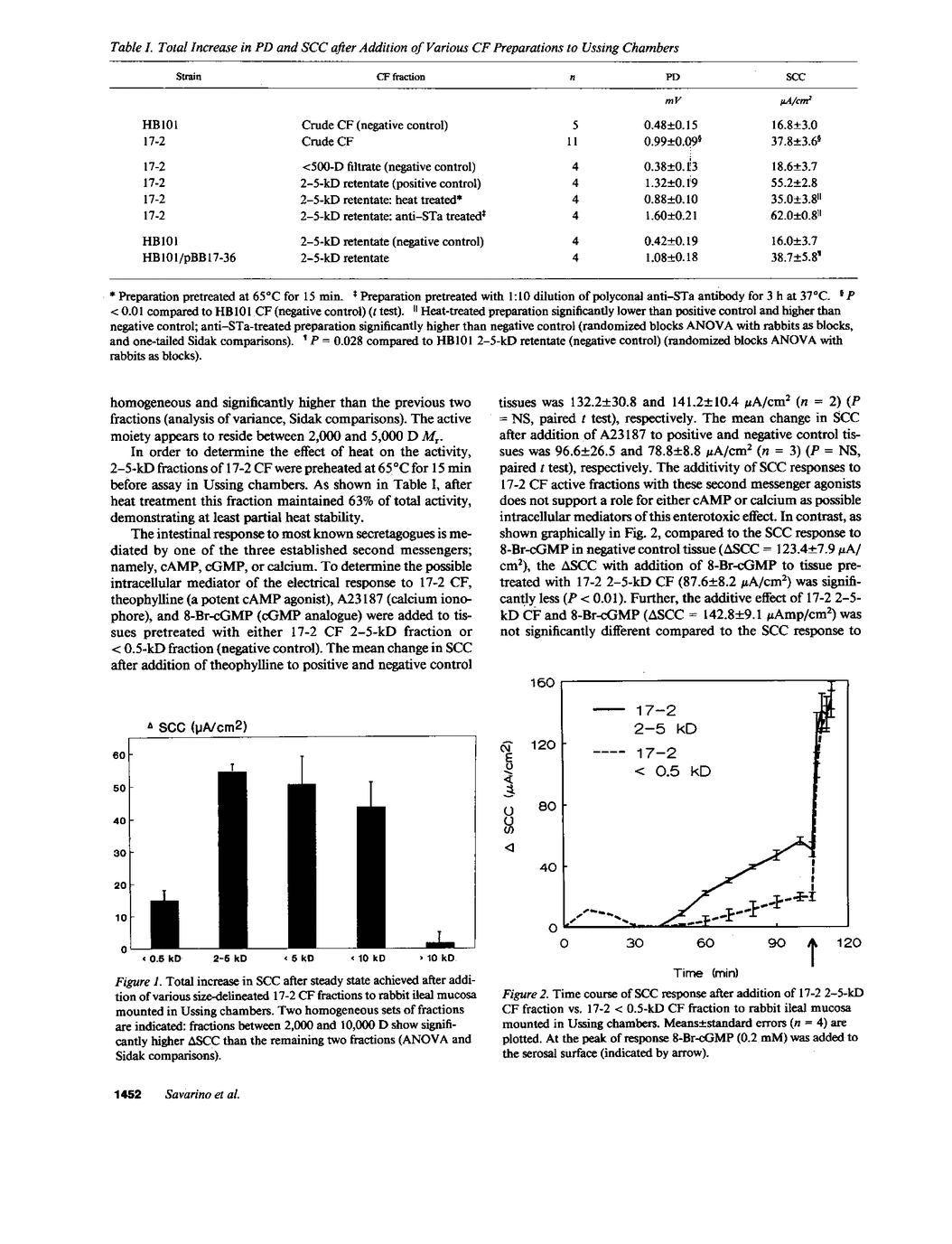 Enteroaggregative Escherichia coli (EAggEC) have been associated with persistent diarrhea in young children, but little is known about its pathogenesis. We assayed for enterotoxic activity in culture filtrates (CF) of EAggEC strains in Ussing chambers mounted with rabbit ileal mucosa. CF from strain 17-2, a prototype Chilean EAggEC strain, caused a greater rise in potential difference and short circuit current (SCC) than that seen in HB101 control, and this effect was abolished by protease pretreatment and partially stable after heat treatment. Ultrafiltration of 17-2 CF preparations localized the active moiety to the 2-5 kD Mr size range. CF from HB101 transformed with the 17-2 plasmid showed Ussing chamber activity. less than 10-kD CF fractions from five of six other EAggEC strains screened in Ussing chambers gave SCC responses of similar magnitude to 17-2. The 17-2 CF activity was not neutralized after pretreatment with polyclonal anti-STa antibody. Additionally, all of the seven EAggEC strains studied were nonreactive by heat-stable enterotoxin variant STa ELISA, were negative in the suckling mouse assay, and failed to hybridize with heat-stable enterotoxin variant STh and STp DNA probes. In summary, our data indicate that 17-2 produces a low molecular weight, partially heat-stable, protease-sensitive enterotoxin which appears to be plasmid associated, and genetically and immunologically distinct from E. coli STa. Preliminary screening suggests that this tox+ phenotype may be common among EAggEC.
