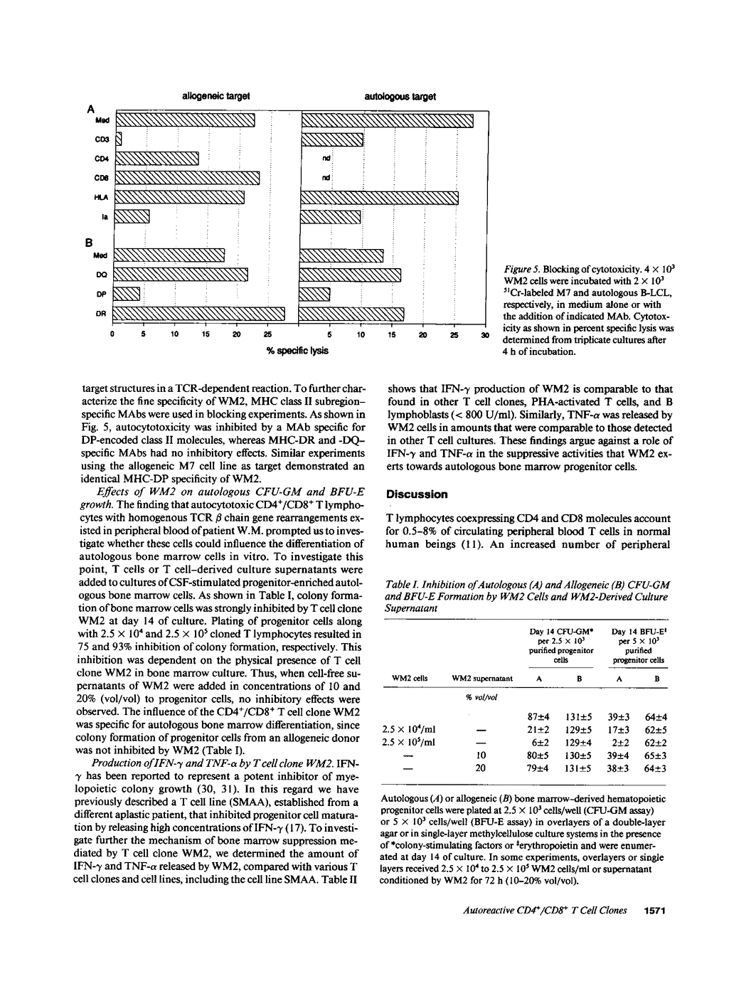 T cell clones were established from peripheral blood of a patient with severe aplastic anemia. 8 of 18 individual clonal T cell populations stably coexpressed CD4 and CD8 molecules, a phenotype characteristic for thymocytes and a minor subpopulation of circulating T lymphocytes. Analysis of T cell receptor genes revealed identical rearrangements of T cell receptor beta chain genes, suggesting clonality of these T cells. CD4+/CD8+ T cells clones were found to be efficiently cytotoxic towards autologous lymphoblasts. Autocytotoxicity could be blocked by a CD3 MAb, a MAb specific for monomorphic MHC class II determinants, and particularly, by an MHC-DP-specific MAb, suggesting specificity for autologous DP molecules. Perhaps more important, CD4+/CD8+ T cell clones inhibited differentiation of autologous progenitor enriched bone marrow cells in vitro by a direct cell-mediated mechanism. These data suggest that circulating cytotoxic CD4+/CD8+ T cell clones specific for autologous MHC-DP determinants may be involved in hematopoietic failure in some cases of aplastic anemia.