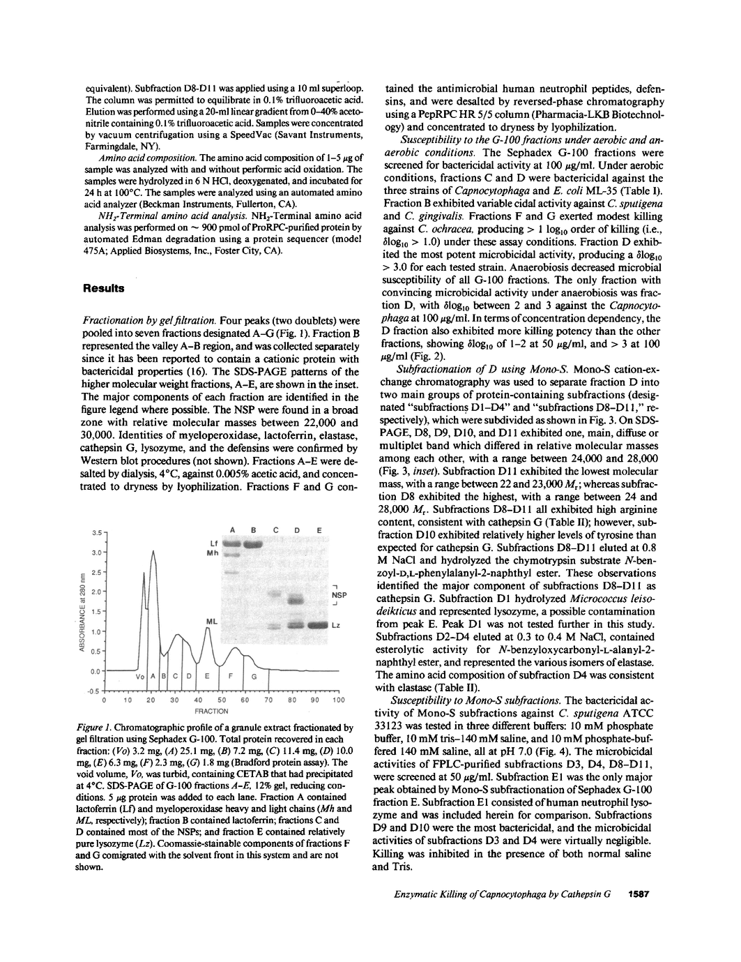 The Capnocytophaga are inhabitants of the hypoxic human gingival crevice that are normally prevented by neutrophils from causing periodontal and systemic infection. To identify potential nonoxidative bactericidal mechanisms against Capnocytophaga within human neutrophils, gel filtration chromatography was used to fractionate neutrophil granule extracts. Seven granule fractions, designated A through G, were obtained. The Capnocytophaga were most sensitive to killing by fraction D. Fraction D exhibited substantial bactericidal activity under aerobic and anaerobic conditions. The bactericidal activity associated with ion-exchange subfractions D8-D11, which contained primarily cathepsin G as assessed by enzymatic activity, amino acid composition, and NH2-terminal sequence. Heat-inactivation, diisopropylfluorophosphate, PMSF, and N-benzyloxycarbonylglycylleucylphenylalanyl-chloromethyl ketone inhibited bactericidal activity against Capnocytophaga sputigena but not Escherichia coli. We conclude that (a) human neutrophil cathepsin G is an important antimicrobial system against the Capnocytophaga, (b) the bactericidal activity of cathepsin G against Capnocytophaga is oxygen independent, and (c) an intact enzyme active site is involved in the killing of C. sputigena but not E. coli. We suggest that human neutrophil cathepsin G is an important antimicrobial system against certain oral bacteria and that cathepsin G kills bacteria by two distinct mechanisms.