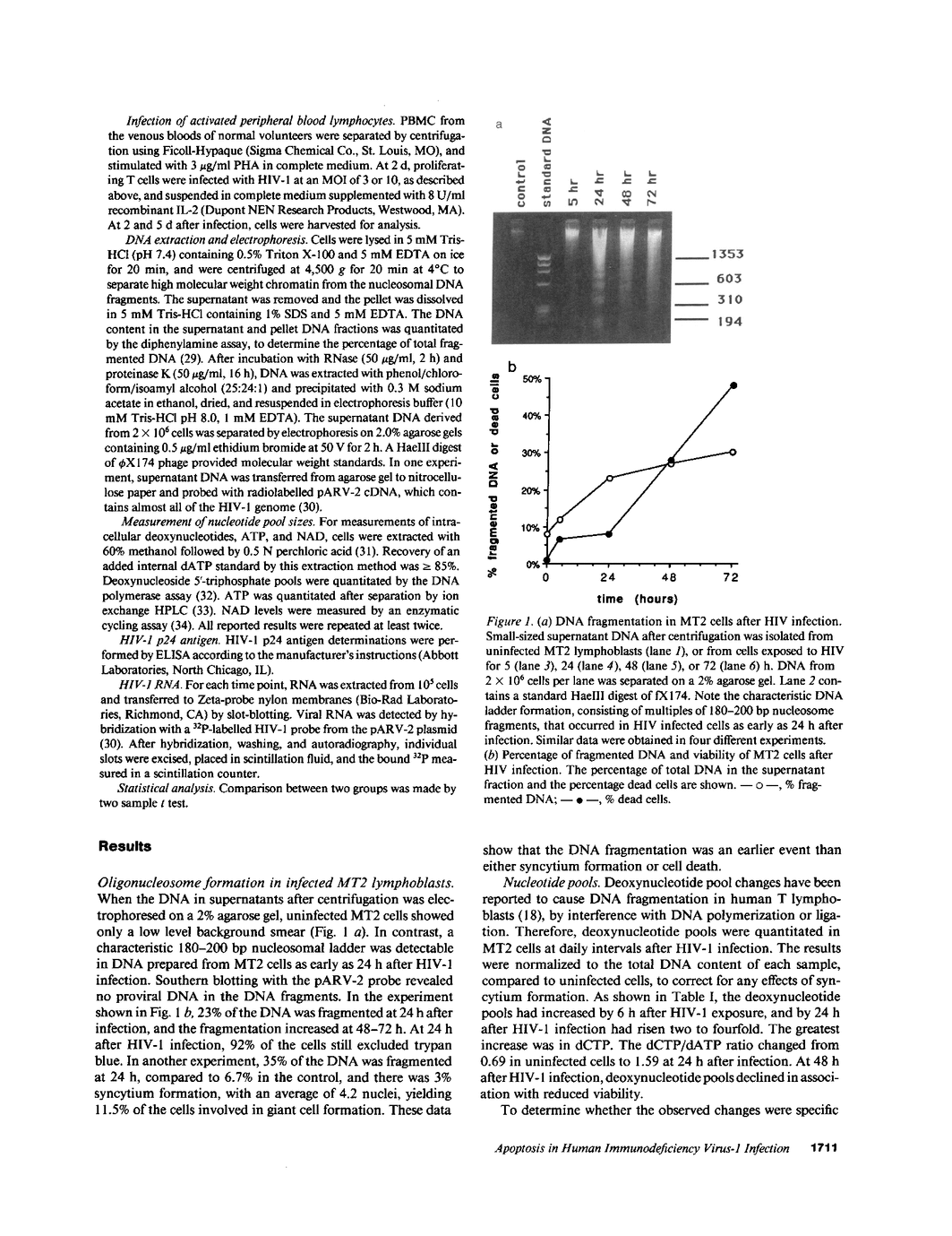 The mechanisms by which HIV-1 infection kills T lymphocytes are not clearly established. Apoptosis is an internally programmed cell death pathway that may regulate both T cell development and senescence, and that is characterized by cleavage of DNA at internucleosomal regions. The present experiments show that acute HIV-1 infection of MT2 lymphoblasts and activated normal peripheral blood mononuclear cells induces apoptosis. The addition of anti-gp120 neutralizing antibody, after HIV-1 infection of MT2 cells, permitted sustained high levels of viral replication, but blocked apoptosis and cell death. Apoptosis may account for the direct cytopathologic effects of HIV-1 in T cells.