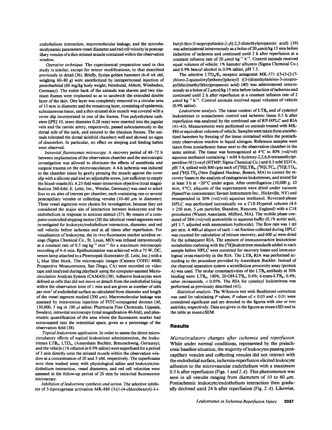 Leukotriene (LT)B4 promotes leukocyte chemotaxis and adhesion to the endothelium of postcapillary venules. The cysteinyl leukotrienes, LTC4, LTD4, and LTE4, elicit macromolecular leakage from this vessel segment. Both leukocyte adhesion to the endothelium and macromolecular leakage from postcapillary venules hallmark the microcirculatory failure after ischemia-reperfusion, suggesting a role of leukotrienes as mediators of ischemia-reperfusion injury. Using the dorsal skinfold chamber model for intravital fluorescence microscopy of the microcirculation in striated muscle in awake hamsters and sequential RP-HPLC and RIA for leukotrienes, we demonstrate in this study that (a) the leukotrienes (LT)B4 and LTD4 elicit leukocyte/endothelium interaction and macromolecular leakage from postcapillary venules, respectively, that (b) leukotrienes accumulate in the tissue after ischemia and reperfusion, and that (c) selective inhibition of leukotriene biosynthesis (by MK-886) prevents both postischemic leukotriene accumulation and the microcirculatory changes after ischemia-reperfusion, while blocking of LTD4/E4 receptors (by MK-571) inhibits postischemic macromolecular leakage. These results demonstrate a key role of leukotrienes in ischemia-reperfusion injury in striated muscle in vivo.
