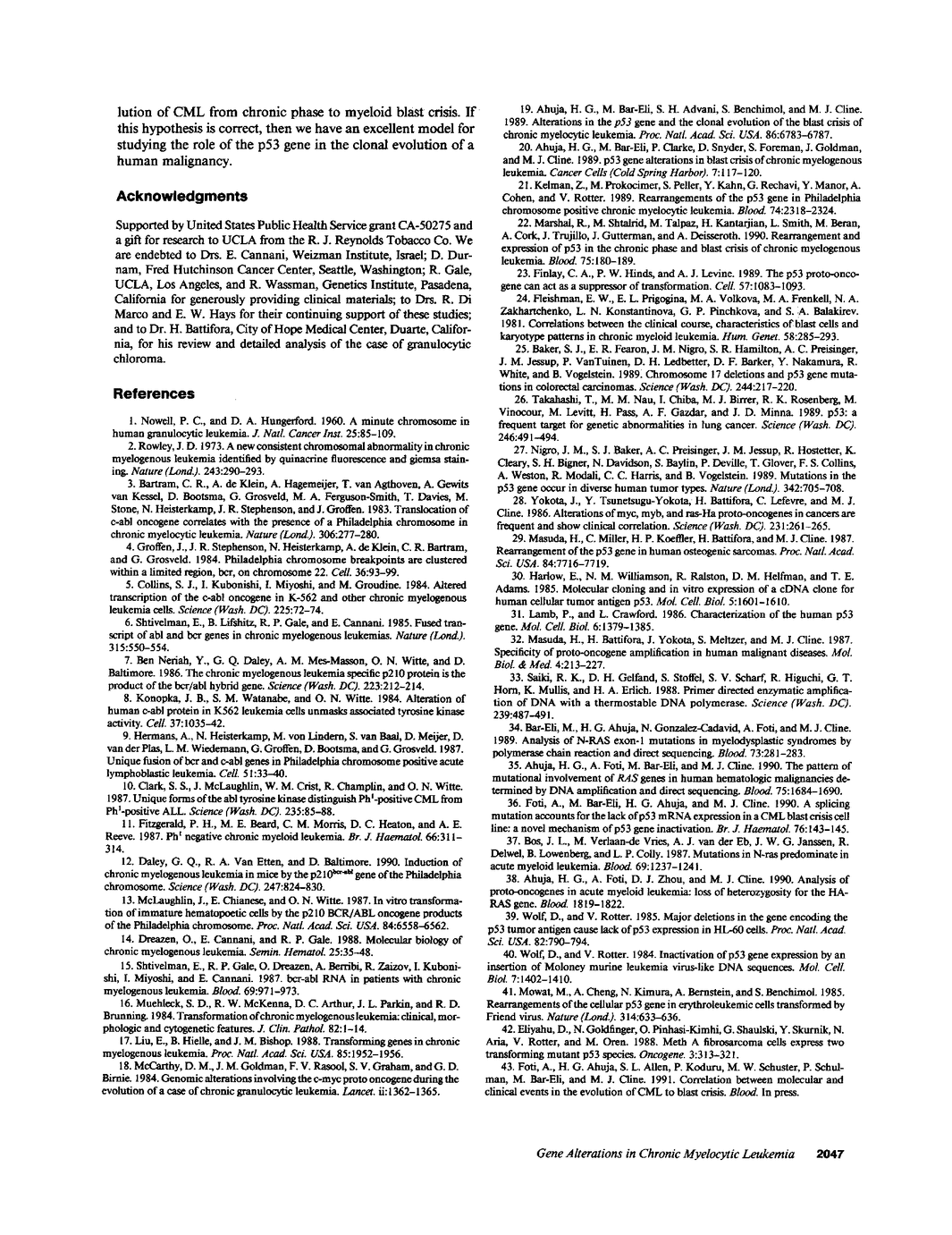 DNA from 135 patients with chronic myelogenous leukemia (CML) at various clinical stages and Philadelphia (Ph1) chromosome positive acute lymphoblastic leukemia was investigated for alterations in a variety of proto-oncogenes which have been implicated in the evolution of CML from its chronic phase to blast crisis. The most common genetic change found in the evolution of typical Ph1 chromosome positive CML to blast crisis was an alteration of the p53 gene involving either a rearrangement, a deletion, or a point mutation in the coding sequence of the gene. Alterations of the p53 gene were found in the myeloid and the rare megakaryocytic variant of blast crisis but were absent in the lymphoid leukemic transformants. Gross structural alterations were seen in 11 of 54 (20%) of myeloid or unknown phenotypes of blast crisis and in only 1 of 44 chronic phase cases. Eight examples of mutations in the open reading frame of the p53 gene at codons 49, 53, 60, 140, 202, 204, 238, and 239 were observed in blast crisis patients. Mutations in the N-RAS gene were rare in typical blast crisis (2 of 27 cases) but were found in megakaryocytic and Ph1 negative myeloid blast crisis. We concluded that heterogeneous alterations in the p53 gene and occasionally in the N-RAS genes accompany the evolution of chronic phase CML to blast crisis.