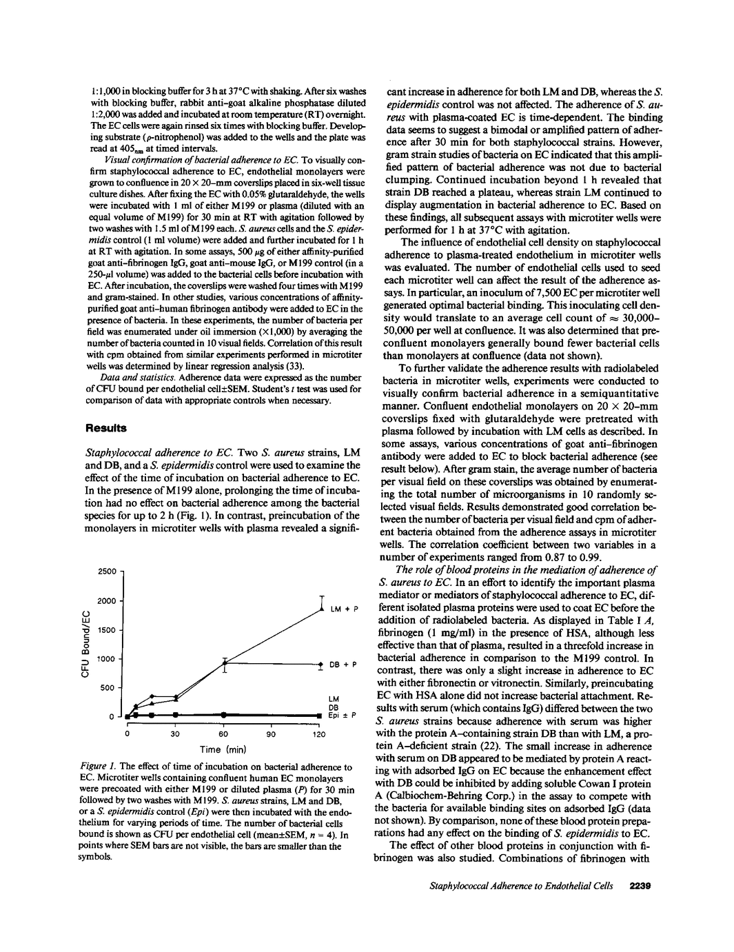 The propensity of Staphylococcus aureus to cause acute endovascular infections during transient bacteremia is poorly understood. To examine the events leading to the attachment of staphylococci to endothelium, adherence assays were developed to study the role of blood factors in the mediation of staphylococcal adherence to cultured human umbilical vein endothelium in vitro. Results indicate that the preferential attachment of S. aureus to endothelial cells is mediated by fibrinogen adsorbed from plasma onto the endothelial surface. The binding is apparently specific because it could be blocked by goat anti-human fibrinogen antibody in a dose-dependent fashion while nonimmune goat IgG, mouse MAb against AG-1 (a platelet antigen found on the endothelial cell surface), nonspecific mouse MAb and rabbit antibodies to human vitronectin and fibronectin were not inhibitory. Our data also indicate that fibrinogen is a necessary but not the only blood constituent in the mediation of binding of S. aureus to endothelium. This was supported by the finding that fibrinogen alone, at a concentration equivalent to that in plasma, did not potentiate staphylococcal adherence as much as plasma while afibrinogenemic plasma reconstituted with fibrinogen did. Because fibrinogen is known to bind to endothelial cells, our data is consistent with the hypothesis that fibrinogen and additional plasma factor(s), possibly activated during inflammation, promote staphylococcal adherence to endothelium. In addition, the role of the fibrinogen binding receptor of S. aureus as an adherence factor to native endothelium is also suggested.