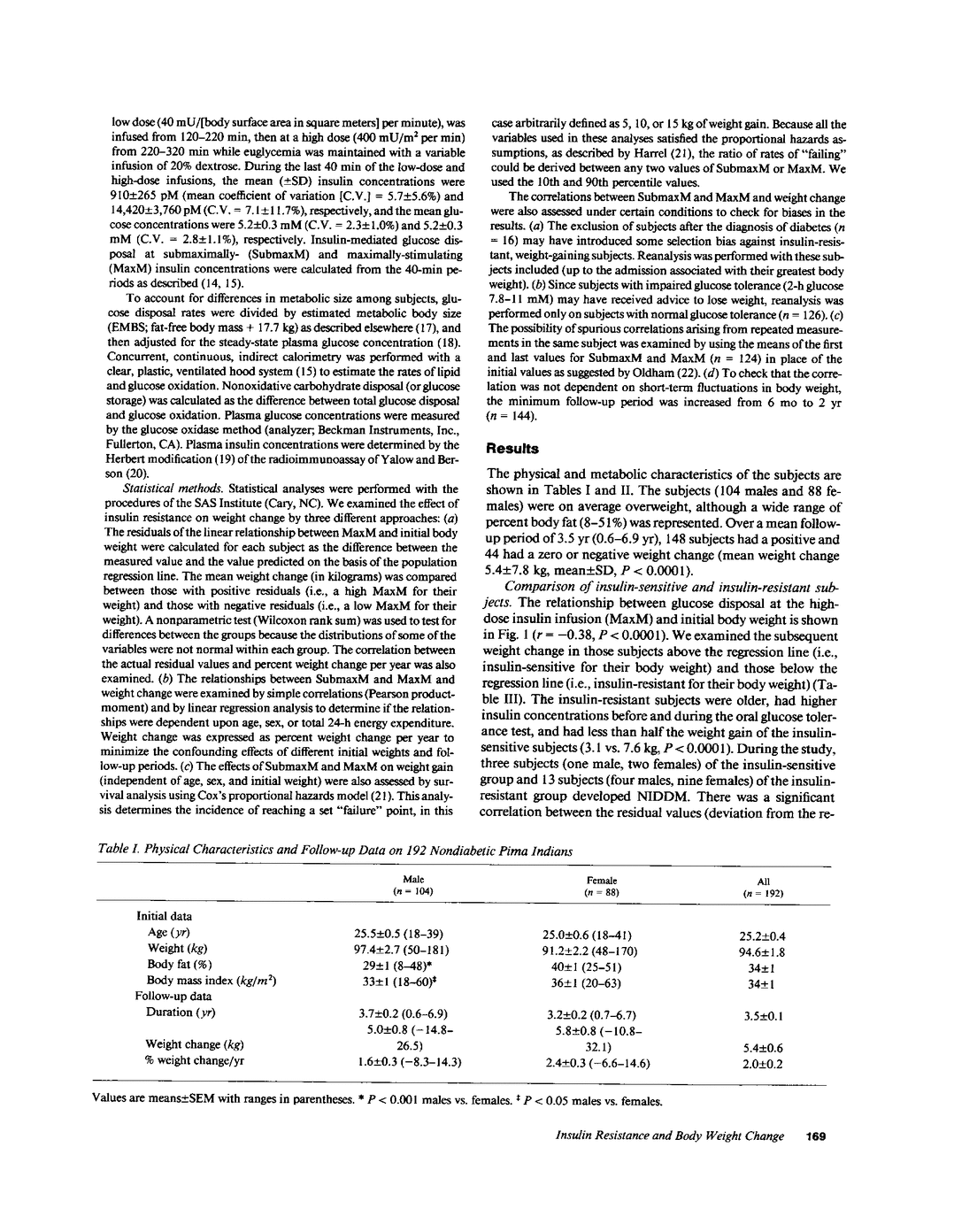 Insulin resistance is commonly associated with obesity and noninsulin-dependent diabetes. Whereas it predicts the development of diabetes, its effect on body weight change is unknown. We measured glucose disposal rates at submaximally- and maximally-stimulating insulin concentrations in 192 nondiabetic Pima Indians and followed their weight change over 3.5 +/- 1.8 y (mean +/- SD). Results: (a) Insulin-resistant subjects gained less weight than insulin-sensitive subjects (3.1 vs. 7.6 kg, P less than 0.0001). (b) The percent weight change per year correlated with glucose disposal at submaximally-(r = 0.19, P less than 0.01) and maximally-stimulating (r = 0.34, P less than 0.0001) insulin concentrations independent of sex, age, initial weight, and 24-h energy expenditure; the correlations were stronger for glucose oxidation than for glucose storage. (c) Weight gain was associated with an increase in insulin resistance more than four times that predicted from the cross-sectional data. We conclude that insulin resistance is associated with a reduced risk of weight gain in nondiabetic Pima Indians.