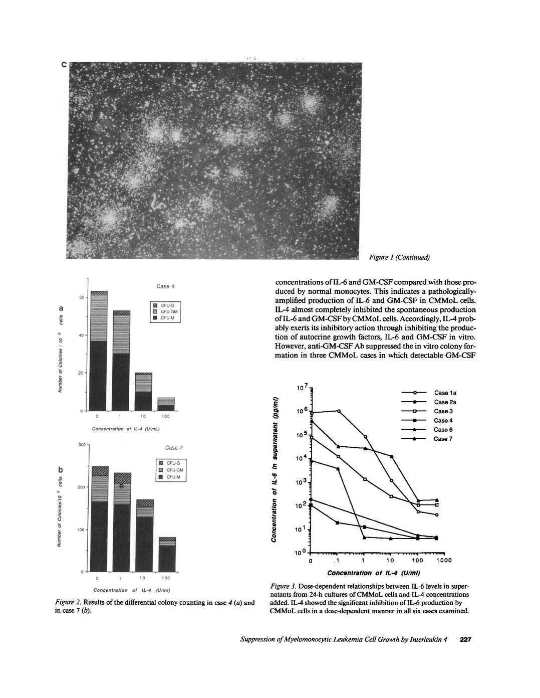 We studied the effects of IL-4 on the spontaneous proliferation of chronic myelomonocytic leukemia (CMMoL) cells in vitro. IL-4 (100 U/ml) suppressed the spontaneous DNA synthesis by approximately 50% in 5 of 8 cases examined. IL-4 (100 U/ml) also inhibited the spontaneous colony formation by CMMoL cells in a methylcellulose culture by 50-97% in all of the 10 cases in which spontaneous colonies were formed. This IL-4-mediated suppression of the growth of CMMoL cells was completely abolished by the addition of anti-IL-4 neutralizing antibodies. The spontaneous CMMoL colonies were substantially suppressed by the addition of either anti-IL-6 or anti-granulocyte/macrophage colony-stimulating factor (GM-CSF) antibodies to the colony assay system: the addition of both anti-IL-6 and anti-GM-CSF antibodies resulted in greater than 80% inhibition of the colony formation by CMMoL cells. On the other hand, none of anti-IL-1-beta, anti-granulocyte-CSF, anti-macrophage-CSF, or anti-tumor necrosis factor-alpha antibodies affected the CMMoL colony formation. In the supernatants from 24-h cultures of CMMoL cells, high levels of IL-6 and GM-CSF were demonstrated in 9 of 9 and 2 of 9 cases examined, respectively. IL-4 (100 U/ml) almost completely inhibited the secretion of IL-6 and GM-CSF by CMMoL cells. These observations suggest that IL-4 suppresses the spontaneous proliferation of CMMoL cells by inhibiting their production of IL-6 and/or GM-CSF, both of which could act in vitro as an autocrine growth factor for CMMoL cells.