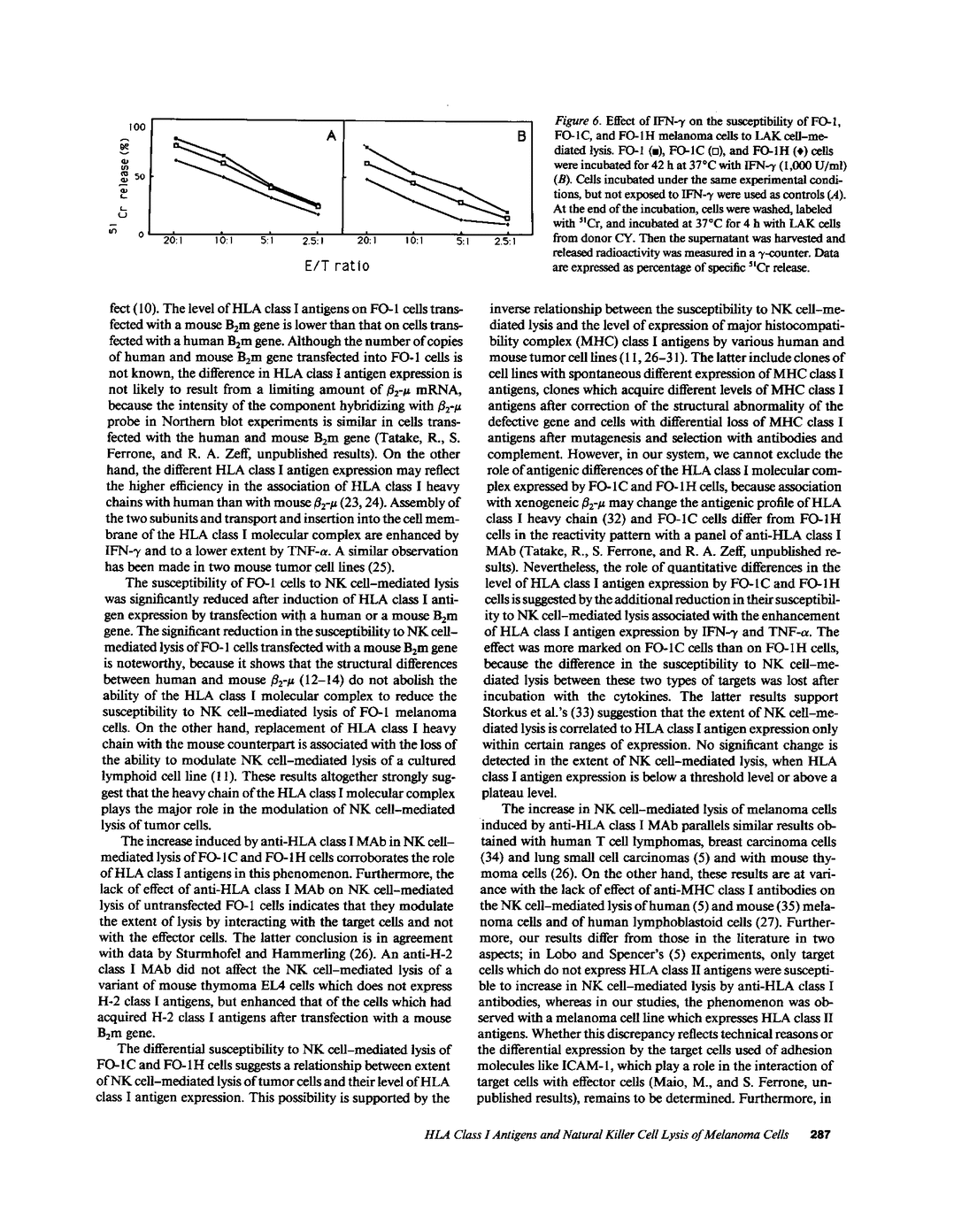 Induction of HLA class I antigens on cultured melanoma cells FO-1 after transfection with a human or a mouse B2m gene was associated with a statistically significant reduction in their susceptibility to natural killer (NK) cell-mediated lysis. These results indicate that the structural differences between human and mouse beta 2-mu do not abolish the ability of the HLA class I molecular complex to modulate NK cell-mediated lysis of melanoma cells FO-1. The role of HLA class I antigens in the phenomenon is corroborated by the ability of anti-HLA class I MAb to enhance, although to a different extent, the susceptibility of transfected FO-1 cells to NK cell-mediated lysis. Gamma interferon (IFN-gamma) and tumor necrosis factor-alpha (TNF-alpha) significantly reduced the susceptibility to NK cell-mediated lysis of transfected FO-1 cells. Surprisingly, TNF-alpha reduced the extent of lysis more than IFN-gamma, although the latter cytokine enhanced HLA class I antigen expression more than the former one. This finding, in conjunction with a reduction in the susceptibility to NK cell-mediated lysis of untransfected FO-1 cells incubated with IFN-gamma or TNF-alpha, suggests that the two cytokines reduce NK cell-mediated lysis of transfected cells by modulating not only the expression of HLA class I antigens, but also that of other structures. Induction of HLA class I antigens and their modulation with IFN-gamma did not affect the susceptibility to lymphokine-activated killer (LAK) cell-mediated lysis of transfected FO-1 cells. Characterization of the molecular mechanism(s) underlying abnormalities in HLA class I antigen expression by melanoma cells and of the role of these molecules in the interactions of melanoma cells with various types of effector cells may suggest novel immunotherapeutic approaches to melanoma.