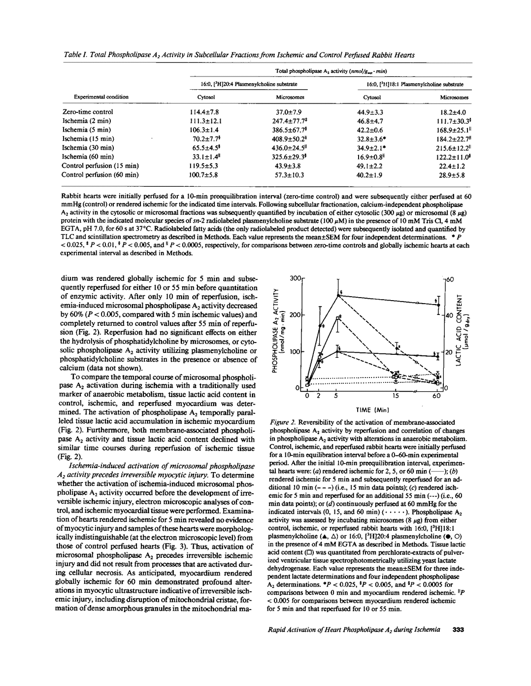 Recent studies have demonstrated the existence of two members of a novel family of calcium-independent plasmalogen-selective phospholipases A2 in mammalian myocardium (Wolf, R. A., and R. W. Gross. 1985. J. Biol. Chem. 260:7295-7303; and Hazen, S. L., D. A. Ford, and R. W. Gross. 1991. J. Biol. Chem. 266:5629-5633). To examine the potential role of these calcium-independent phospholipases A2 in mediating membrane dysfunction during early myocardial ischemia, the temporal course of alterations in phospholipase A2 activity during global ischemia in Langendorf perfused rabbit hearts was quantified and compared with traditionally accepted markers of myocytic ischemic injury and anaerobic metabolism. We now report that membrane-associated calcium-independent plasmalogen-selective phospholipase A2 activity increased over 400% during 2 min of global ischemia (P less than 0.01), was near maximally activated (greater than 10-fold) after only 5 min of ischemia, and remained activated throughout the entire ischemic interval examined (2-60 min). Activation of membrane-associated plasmalogen-selective phospholipase A2 after 5 min of myocardial ischemia was rapidly reversible during reperfusion of ischemic tissue. Both the activation of phospholipase A2 and its reversibility during reperfusion were temporally correlated to alterations in myocytic anaerobic metabolism. Furthermore, activation of membrane-associated phospholipase A2 was essentially complete before electron microscopic evidence of cellular damage. Collectively, these results identify dynamic alterations in calcium-independent plasmalogen-selective phospholipase A2 activity during myocardial ischemia which precede irreversible cellular injury and demonstrate that activation of plasmalogen-selective phospholipase A2 is amongst the earliest biochemical alterations in ischemic myocardium.