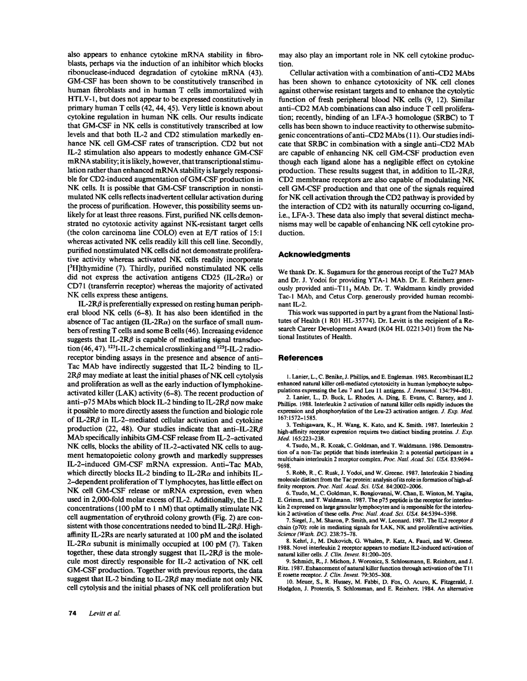 Resting natural killer (NK) cells express the p75 chain of the IL-2 receptor (IL-2R beta) and most NK cells express the CD2 (erythrocyte rosette) receptor. The cell adhesion molecule, LFA-3, is a natural co-ligand for CD2. Tac antigen (IL-2R alpha), a p55 IL-2R subunit, can be expressed after NK activation and may play a role in IL-2-induced NK proliferation. Little is known of the molecular mechanisms underlying cytokine production in NK cells. We investigated the roles of IL-2R alpha, IL-2R beta, and CD2/LFA-3 in the molecular regulation of NK cell granulocyte/macrophage-colony-stimulating factor (GM-CSF) production. Enriched populations of peripheral blood NK cells were separated into CD16-positive and CD16-negative fractions by flow cytometry; positively selected cells were greater than 97% positive for CD16 (the FcIII receptor for IgG which is present on almost all NK cells), less than 1% positive for the T cell antigen CD3, and did not demonstrate rearrangement of the T cell receptor beta chain gene by Southern blot. NK cell supernatants were harvested after 3-4 d of incubation with 0-100 U/ml IL-2, or after incubation with anti-CD2 (T11(3] MAb and sheep red blood cells (SRBC are a homologue for LFA-3). Parallel cell aliquots were harvested at 3-16 h for transcriptional run-on assays, S1 nuclease assays, and actinomycin D mRNA t1/2 determinations. IL-2-activated NK supernatants contained large amounts of GM-CSF (178 +/- 35 pg/ml) by ELISA as did supernatants from CD2-activated NK cells (T11(3) MAb + SRBC: 212 +/- 42) vs. less than 20 pg/ml for NK cells incubated alone or with either SRBC or T11(3) MAb alone. Sepharose-linked anti-CD3 MAb did not induce GM-CSF release from NK cells. By S1 analysis, both IL-2 and CD2 stimulation markedly augmented GM-CSF mRNA expression but with very different latencies of onset. IL-2R beta MAb inhibited greater than 85% of GM-CSF release from IL-2-activated NK cells and markedly suppressed IL-2-induced GM-CSF mRNA expression, whereas IL-2R alpha MAb even at 2,000-fold molar excess of IL-2 had little effect (less than 10%) on either GM-CSF release or mRNA expression. Run-on assays showed that GM-CSF is constitutively transcribed in NK cells and that IL-2 and CD2-activated cells had a three- to fourfold increased rate of GM-CSF transcription compared to nonstimulated cells. The t1/2 of GM-CSF mRNA in IL-2-activated NK cells was identical to that of unstimulated NK cells (15 min), whereas GM-CSF mRNA t1/2 in CD2-activated NK cells was increased 2.5-fold. We conclude that GM-CSF production in NK cells is regulated by both the IL-2Rbeta and the CD2 receptor but not by IL-2Ralpha, that both transcriptional and posttranscriptional signals act together to modulate the level of GM-CSF mRNA in NK cells, and that the molecular mechanisms underlying NK cell GM-CSF production are dependent in part on differential surface receptor activation.