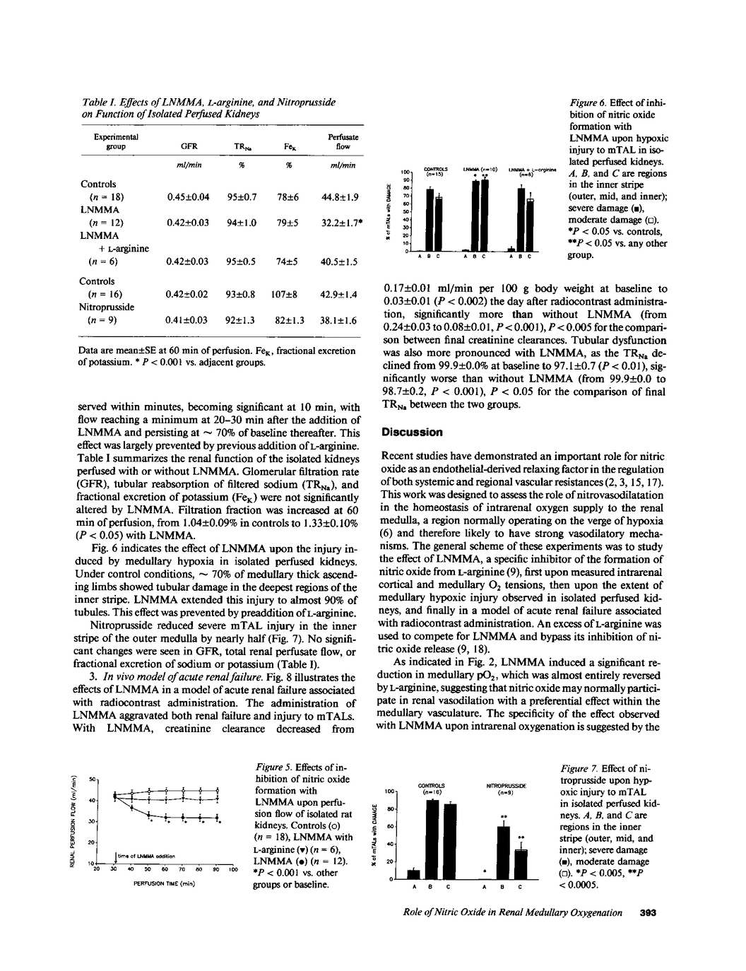 We investigated the role of the endothelial-derived relaxing factor nitric oxide (NO) in the homeostasis of O2 supply to the renal medulla, a region normally operating on the verge of hypoxia. Sensitive Clark-type O2 microelectrodes were inserted into renal cortex and medulla of anesthetized rats. The inhibitor of NO formation, L-NG-monomethylarginine (LNMMA), while increasing blood pressure and reducing renal blood flow, decreased medullary pO2 from 23 +/- 3 mmHg to 12 +/- 3 (P less than 0.001), with no change in the cortex. These responses were promptly reversed by L-arginine, which bypasses the LNMMA blockade. In isolated rat kidneys, LNMMA reduced perfusion flow without altering glomerular filtration rate, and augmented deep medullary hypoxic injury to thick ascending limbs from 68 to 90% of the tubules (P less than 0.02). These changes were prevented by L-arginine. Nitroprusside had a protective effect upon thick limb injury. Finally, in a previously reported model of radiocontrast nephropathy (1988. J. Clin. Invest. 82:401), LNMMA increased the severity of renal failure (final plasma creatinine from 2.3 +/- 2 mg% to 3.4 +/- 3, P less than 0.005) and the proportion of damaged thick limbs (from 24 +/- 6% to 53 +/- 9, P less than 0.01). Nitrovasodilatation may participate in the balance of renal medullary oxygenation and play an important role in the prevention of medullary hypoxic injury.
