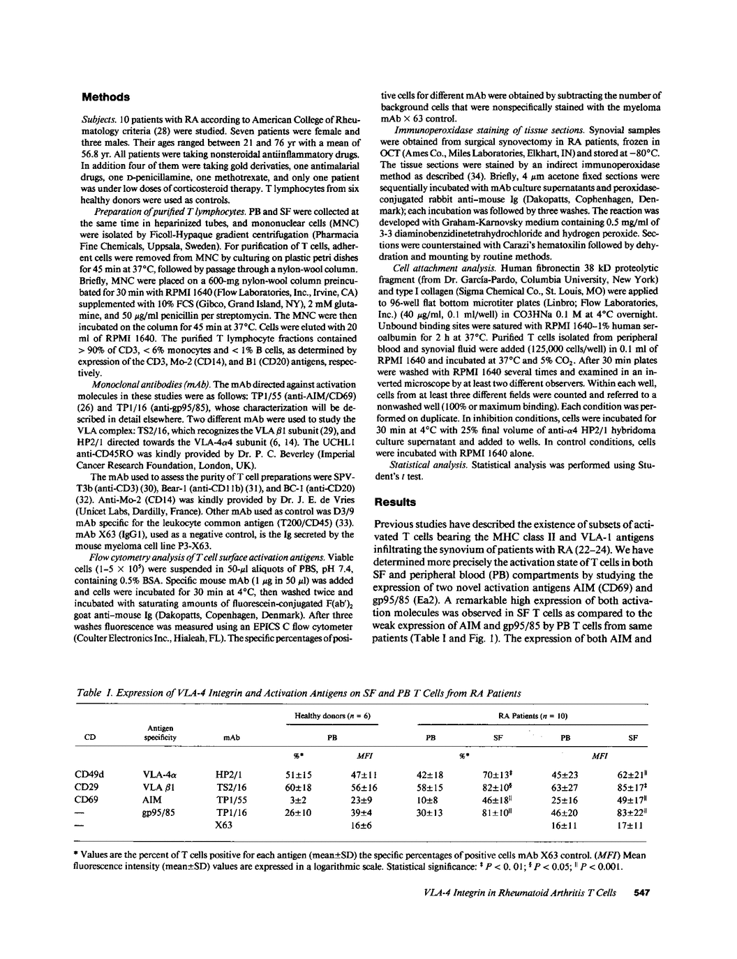 The VLA-4 (CD49d/CD29) integrin is a cell surface receptor involved in the interaction of lymphoid cells with both extracellular matrix (ECM) and endothelial cells. We have investigated the expression and function of VLA-4 fibronectin (FN) receptors on T cells localized in the inflammed synovium of patients with rheumatoid arthritis (RA). A high proportion of T cells in both synovial membrane (SM) and synovial fluid (SF) expressed the activation antigens AIM (CD69) and gp95/85 (Ea2) as well as an increased number of VLA-4 alpha and beta 1 adhesion molecules, as compared with peripheral blood (PB) T cells from the same patients. Furthermore, the majority of these activated SF T cells were able to adhere to a 38-kD FN proteolytic fragment containing the connecting segment-1 (CS-1) specifically through VLA-4 receptors, whereas a significantly lower proportion of PB T cells displayed this capacity. Therefore, our results show that activated T cells selectively localize at sites of tissue injury in RA disease and provide evidence for the in vivo regulation of the expression and function of the VLA-4 integrin. This regulatory mechanism may enable T cells either to facilitate migration or to persist at sites of inflammation.