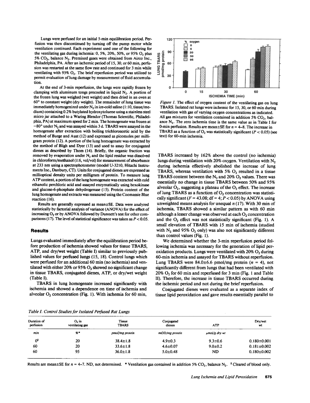 The effect of alveolar oxygen tension on lung lipid peroxidation during lung ischemia was evaluated by using isolated rat lungs perfused with synthetic medium. After a 5-min equilibration period, global ischemia was produced by discontinuing perfusion while ventilation continued with gas mixtures containing 5% CO2 and a fixed oxygen concentration between 0 and 95%. Lipid peroxidation was assessed by measurement of tissue thiobarbituric acid-reactive products and conjugated dienes. Control studies (no ischemia) showed no change in parameters of lipid peroxidation during 1 h of perfusion and ventilation with 20% or 95% O2. With 60 min of ischemia, there was increased lipid peroxidation which varied with oxygen content of the ventilating gas and was markedly inhibited by ventilation with N2. Perfusion with 5-, 8-, 11-, 14-eicosatetraynoic acid indicated that generation of eicosanoids during ischemia accounted for approximately 40-50% of lung lipid peroxide production. Changes of CO2 content of the ventilating gas (to alter tissue pH) or of perfusate glucose concentration had no effect on lipid peroxidation during ischemia, but perfusion at 8% of the normal flow rate prevented lipid peroxidation. Lung dry/wet weight measured after 3 min of reperfusion showed good correlation between lung fluid accumulation and lipid peroxidation. These results indicate that reperfusion is not necessary for lipid peroxidation with ischemic insult of the lung and provide evidence that elevated PO2 during ischemia accelerates the rate of tissue injury.
