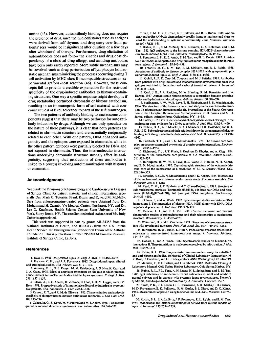 Increasing evidence suggests that autoantibodies in the rheumatic diseases are a consequence of immune selection by self-material, but the nature of the in vivo immunogen is unknown. Insight into this problem may be obtained by measuring autoantibody binding to various forms of a target antigen. Antihistone antibodies arising as a side effect of therapy with various drugs offer an opportunity to explore this premise because many forms of histone have been characterized and adapted to ELISA formats. Two patterns of antibody reactivity were observed. All 21 patients with symptomatic procainamide-induced lupus and 7 of 12 patients with quinidine-induced lupus had IgG antibodies reacting predominantly with the (H2A-H2B)-DNA complex and with chromatin. In contrast, antibodies in 19 of 24 patients taking procainamide without accompanying lupus-like symptoms did not show any pattern. The second pattern was observed in 18/19 chlorpromazine-treated patients and 14/17 patients with hydralazine-induced lupus in which IgM antibodies displayed more reactivity with DNA-free histones than with the corresponding histone-DNA complexes and almost no binding to H1-stripped chromatin. Absorption studies were entirely consistent with these results. Thus, the two patterns of reactivity with nucleosomal components reflect the molecular substructure of chromatin, suggesting that two processes underlie antihistone antibody induction by drugs. In one, IgG autoantibodies appear to be elicited by chromatin, whereas in the other, autoimmune tolerance to native chromatin appears largely intact, and IgM antibodies may be driven by DNA-free histone.