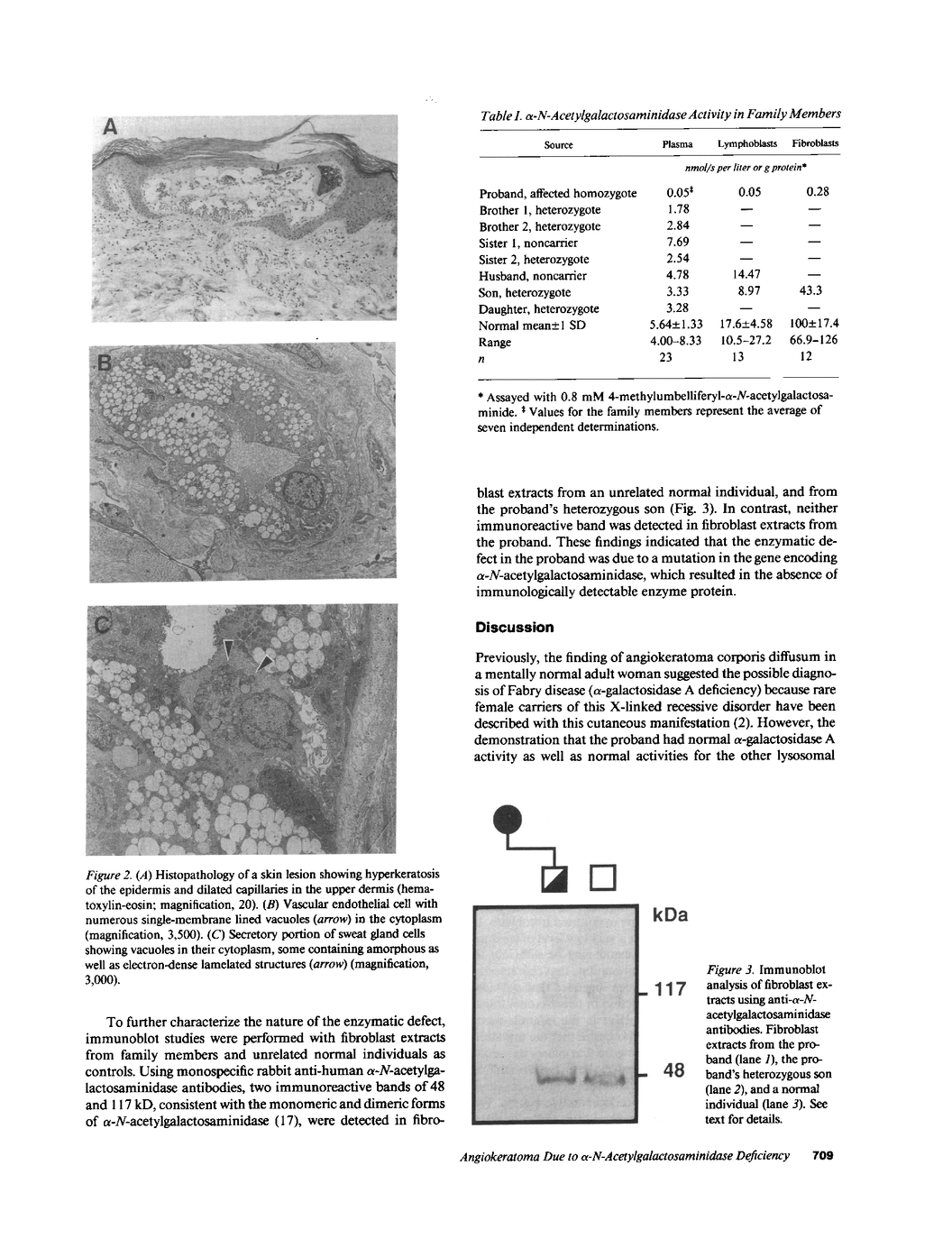 Recently a novel case of angiokeratoma corporis diffusum with glycoaminoaciduria was described in a 46-yr-old Japanese woman. Known causes of the cutaneous manifestation were eliminated by enzyme analyses, and further characterization of the accumulated urinary O-linked sialopeptides revealed identity to those excreted by patients with an infantile neuroaxonal dystrophy due to lysosomal alpha-N-acetylgalactosaminidase deficiency. Investigation of the alpha-N-acetylgalactosaminidase activity and protein in the proband revealed less than 2% of normal activity and the absence of detectable immunoreactive enzyme protein, findings comparable to those in the patients with infantile neuroaxonal dystrophy and alpha-N-acetylgalactosaminidase deficiency. In addition, the proband's unaffected offspring had half-normal levels of alpha-N-acetylgalactosaminidase activity, consistent with this enzymatic deficiency being the primary metabolic defect in this autosomal recessive trait. Ultrastructural examination of skin and blood cells from the adult proband revealed the presence of prominent lysosomal inclusions containing diffuse amorphous and filamentous material. In contrast, these morphologic findings were not observed in the nonneural tissues from patients with infantile neuroaxonal dystrophy and alpha-N-acetylgalactosaminidase deficiency. These studies document the occurrence of two forms of alpha-N-acetylgalactosaminidase deficiency and sialopeptiduria, a severe infantile-onset form of neuroaxonal dystrophy without angiokeratoma or visceral lysosomal inclusions and an adult-onset form characterized by angiokeratoma, extensive lysosomal accumulation of sialoglycopeptides and the absence of detectable neurologic involvement.