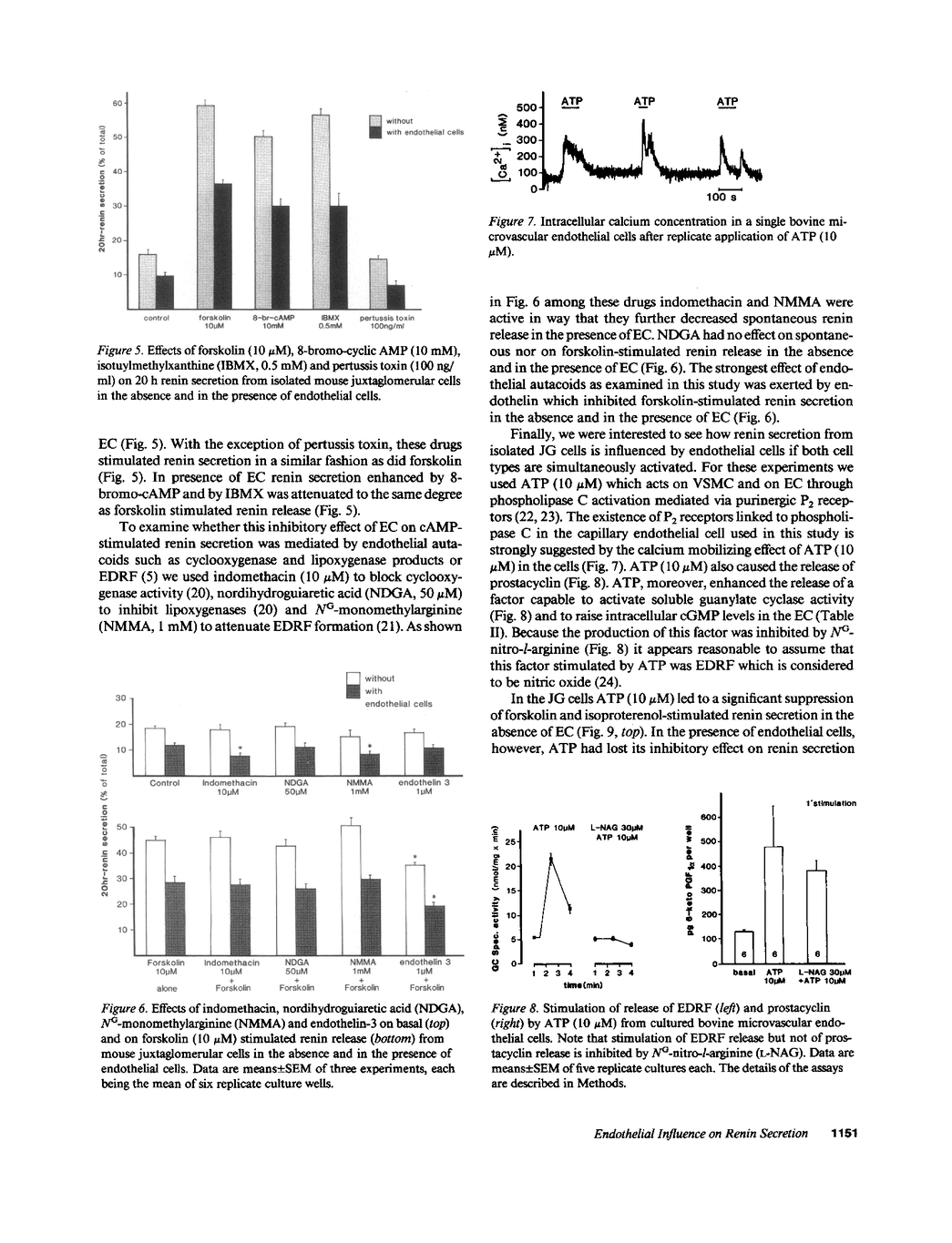 Utilizing cocultures of mouse renal juxtaglomerular cells with bovine microvascular endothelial cells, we have examined whether endothelial cells exert direct influence on renin secretion from renal juxtaglomerular cells. In the presence of endothelial cells both spontaneous and forskolin (10 microM) or isoproterenol (10 microM) stimulated renin release were markedly attenuated. The stimulatory effect of the calmodulin antagonist calmidazolium (10 microM) on renin secretion was not altered by endothelial cells, whereas the stimulatory effect of ethylisopropylamiloride (50 microM) an inhibitor of sodium-proton exchange was enhanced in the presence of endothelial cells. Indomethacin (10 microM) and NG-monomethyl-l-arginine (NMMA) (1 mM) used to inhibit cyclooxygenase activity and production of endothelium-derived relaxing factor (EDRF) decreased spontaneous renin release in the presence of endothelial cells only, but had no effect on forskolin stimulated renin secretion. Endothelin (1 microM) inhibited cAMP stimulated renin release both in the absence and in the presence of endothelial cells. ATP (10 microM) which acts on both endothelial and juxtaglomerular cells via purinergic P2 receptors inhibited cAMP stimulated renin release only in the absence but not in the presence of endothelial cells. This modulatory effect of endothelial cells was no altered by indomethacin nor by NMMA. Taken together, our findings provide first evidence for a local control function of the endothelium on cAMP stimulated renin secretion from renal juxtaglomerular cells, which could in part be mediated by endothelin.