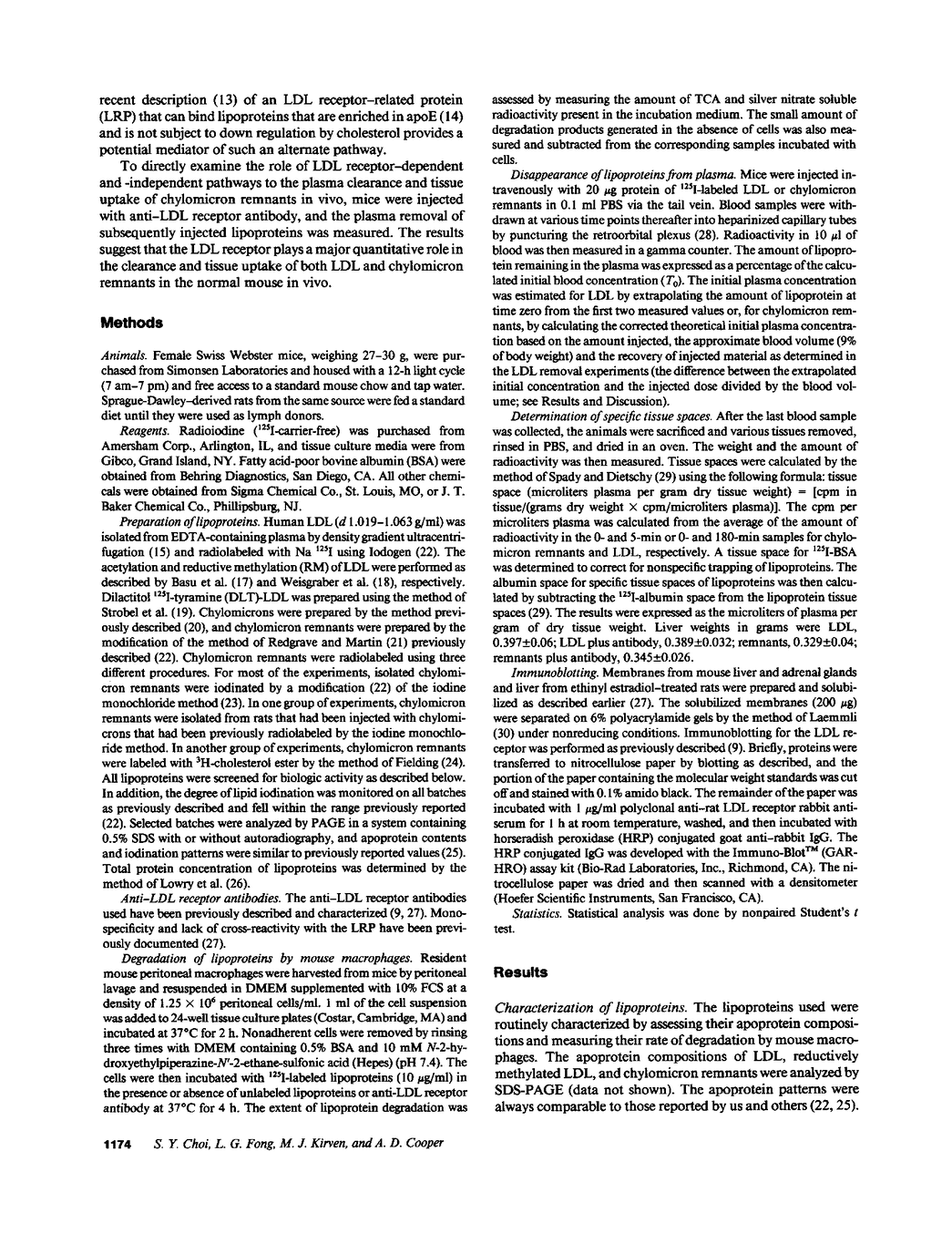 Lipoproteins are removed from the plasma by LDL receptor-dependent and -independent pathways. The relative contribution of these has been established for LDL by using modified lipoproteins, but this has not been possible for apoE-rich lipoproteins, such as chylomicron remnants. To do this, we used a monospecific antibody to the rat LDL receptor. The antibody was injected intravenously into mice followed by 125I-lipoproteins. Blood samples were obtained sequentially and radioactivity measured to determine the plasma clearance of the lipoproteins. The animals were then sacrificed and the tissues removed, dried, and the radioactivity measured to determine tissue uptake. An albumin space was also measured to correct for blood trapping. With 125I-human LDL, approximately 50% of the injected dose was cleared in 180 min. This was reduced to 30% by the antibody and this was identical to the disappearance of reductively methylated LDL. This is a lower estimate of LDL-mediated uptake (40%) than in other species. LDL uptake per gram tissue was similar for the liver and the adrenal gland and was approximately 50% LDL receptor-dependent in both tissues. With 125I-chylomicron remnants, clearance was much more rapid with approximately 50% cleared in 5 min. By agarose gel electrophoresis, radioactivity was not transferred from chylomicron remnants to other lipoprotein classes. Chylomicron remnants with label on only apoB or in 3H-cholesterol esters showed a similar pattern. Combining the estimates of the three labeling procedures, approximately 35% of the 30 s and 25% of the 5 min chylomicron remnant disappearance was LDL receptor dependent. The liver, per gram tissue, took up five times as much radioactivity as the adrenal gland. At 5 min, at least 50% of this was LDL receptor-dependent in liver and 65% in adrenal gland. We conclude that the LDL receptor plays a major, and somewhat similar quantitative role in the clearance of both LDL and chylomicron remnants in the mouse. However, at least in the mouse, non-LDL receptor-mediated lipoprotein clearance is quantitatively important and is also very rapid for chylomicron remnants. Thus, for chylomicron remnants, it can easily compensate for LDL receptors if they are blocked or absent. Further, the tissue distribution of lipoprotein uptake may be directed by factors other than LDL receptor density.