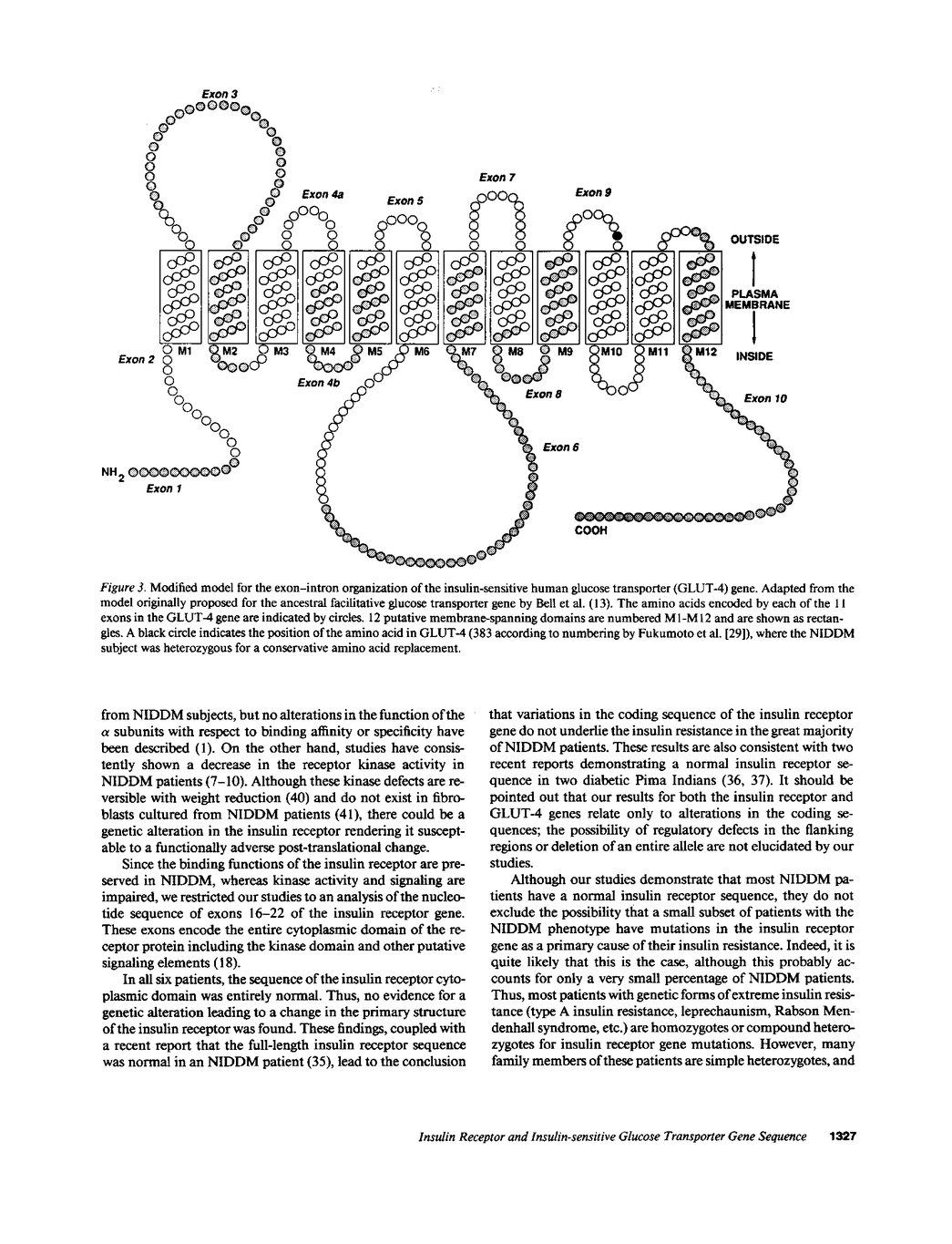 Insulin resistance is a common feature of non-insulin-dependent diabetes mellitus (NIDDM) and "diabetes susceptibility genes" may be involved in this abnormality. Two potential candidate genes are the insulin receptor (IR) and the insulin-sensitive glucose transporter (GLUT-4). To elucidate whether structural defects in the IR and/or GLUT-4 could be a primary cause of insulin resistance in NIDDM, we have sequenced the entire coding region of the GLUT-4 gene from DNA of six NIDDM patients. Since binding properties of the IRs from NIDDM subjects are normal, we also analyzed the sequence of exons 16-22 (encoding the entire cytoplasmic domain of the IR) of the IR gene from the same six patients. When compared with the normal IR sequence, no difference was found in the predicted amino acid sequence of the IR cytoplasmic domain derived from the NIDDM patients. Sequence analysis of the GLUT-4 gene revealed that one patient was heterozygous for a mutation in which isoleucine (ATC) was substituted for valine (GTC) at position 383. Consequently, the GLUT-4 sequence at position 383 was determined in 24 additional NIDDM patients and 30 nondiabetic controls and all showed only the normal sequence. From these studies, we conclude that the insulin resistance seen in the great majority of subjects with the common form of NIDDM is not due to genetic variation in the coding sequence of the IR beta subunit, nor to any single mutation in the GLUT-4 gene. Possibly, a subpopulation of NIDDM patients exists displaying variation in the GLUT-4 gene.