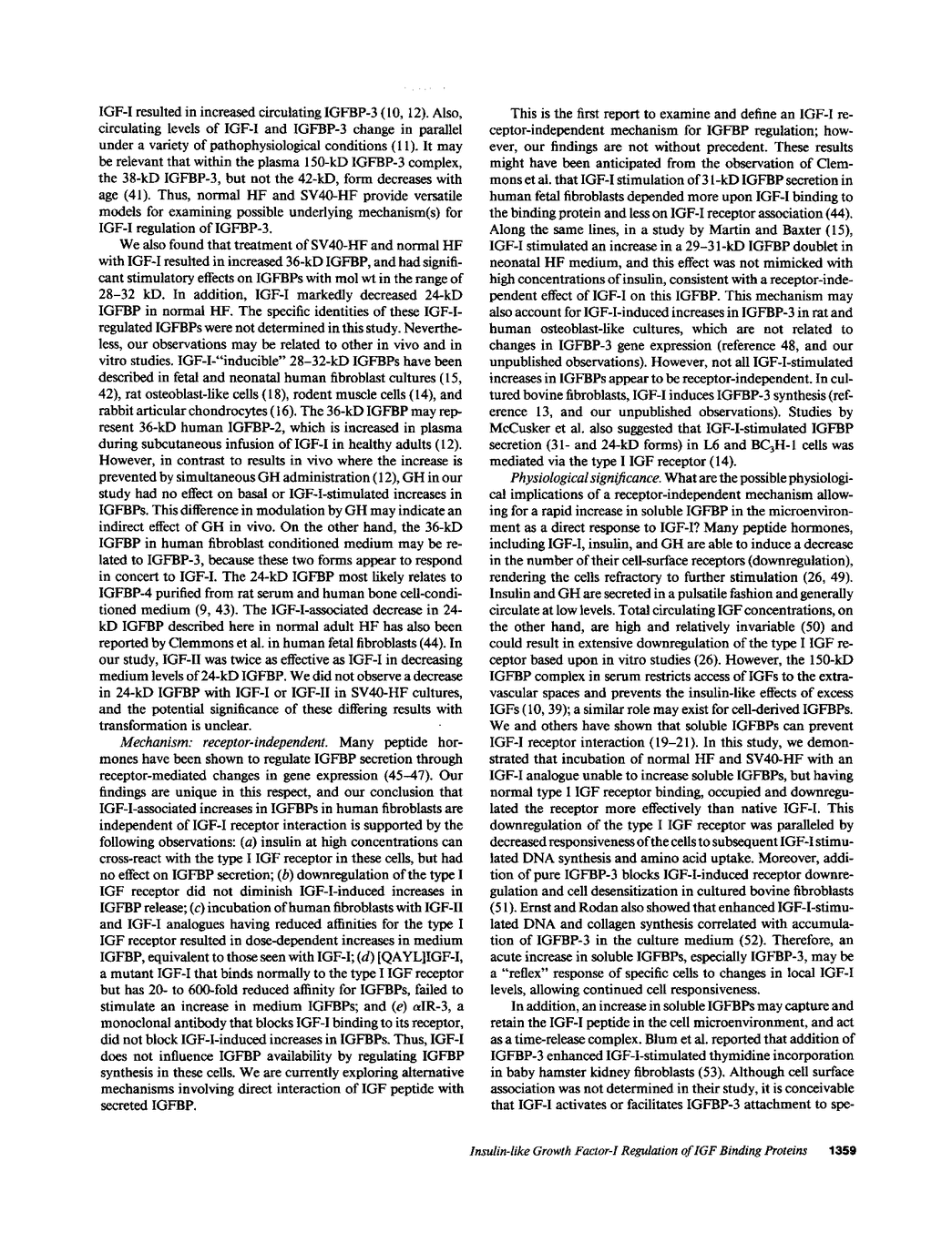 Insulin-like growth factor I and II (IGF-I and IGF-II) associate with specific IGF binding proteins (IGFBPs) present in plasma and extracellular fluids that can modulate the anabolic effects of these peptides. IGF-I has been shown to increase IGFBP concentrations in vivo and in vitro, but the mechanism and significance of this action are unknown. We examined these issues using normal and simian virus 40-transformed adult human fibroblasts (SV40-HF) in culture. Treatment with IGF-I markedly stimulated the appearance of IGFBP-3 (42/38 kD doublet), a 36 kD IGFBP, and 28-32 kD IGFBPs in the medium of these cells, as assessed by Western ligand blotting; IGF-I decreased levels of 24 kD IGFBP in normal HF cultures. The IGF-I-induced change in IGFBP levels was not a type I IGF receptor-mediated effect on IGFBP synthesis because (a) high concentrations of insulin did not mimic IGF-I's effect; (b) IGF-II and IGF-I analogues having reduced affinity for the IGF-I receptor were equipotent with IGF-I in increasing medium IGFBPs; (c) [QAYL]IGF-I, and IGF-I analogue having normal receptor affinity and decreased affinity for IGFBPs, had no effect; and (d) alpha IR-3, a monoclonal antibody specific for the type I IGF receptor, did not block IGF-I-stimulated increases in IGFBPs. In physiological studies, preincubation with 1 nM IGF-I had no effect on type I IGF receptor binding in normal HF and SV40-HF. In contrast, preincubation of cells with an equivalent concentration of [QAYL]IGF-I downregulated the receptors 40-50%. Changes in cell surface receptor number were reflected in cell responsiveness to IGF-I-stimulated [3H]thymidine incorporation and [3H]aminoisobutyric acid uptake. In conclusion, IGF-I regulates the availability of specific IGFBPs in cultured human fibroblasts by a novel receptor-independent mechanism. Rapid changes in levels of soluble IGFBPs as a direct response to extracellular IGF-I, in turn, modulate IGF-I peptide and receptor interaction, and may constitute an important level of control in IGF cellular physiology.