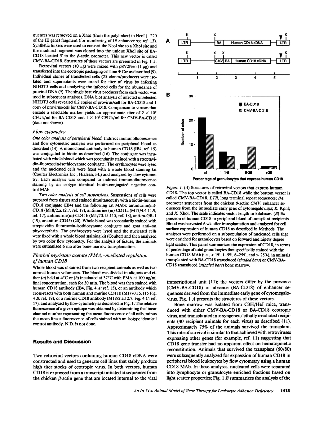 Leukocyte adhesion deficiency (LAD) is an inherited disorder of leukocyte function that is caused by defects in the CD18 gene and is associated with diminished cell surface expression of CD11/CD18 proteins. We have developed an in vivo model for gene therapy of LAD. Recombinant retroviruses were used to transduce a functional human CD18 gene into murine bone marrow cells which were transplanted into lethally irradiated syngeneic recipients. A reliable flow cytometric assay for human CD18 in transplant recipients was developed based on: (a) the availability of human specific CD18 monoclonal antibodies and (b) the observation that human CD18 can form chimeric heterodimers with murine CD11a on the cell surface. Human CD18 was detected on leukocytes in a substantial number of transplant recipients for at least 6 mo suggesting that the gene had been transduced into stem cells. Expression was demonstrated in several lineages of a variety of hematopoietic tissues, but was consistently highest and most frequent in granulocytes. Murine granulocytes demonstrated appropriate posttranscriptional regulation of human CD18 in response to activation of protein kinase C. No apparent untoward effects of human CD18 expression were noted in transplant recipients. These studies suggest a specific strategy for LAD gene therapy that may be effective and safe.